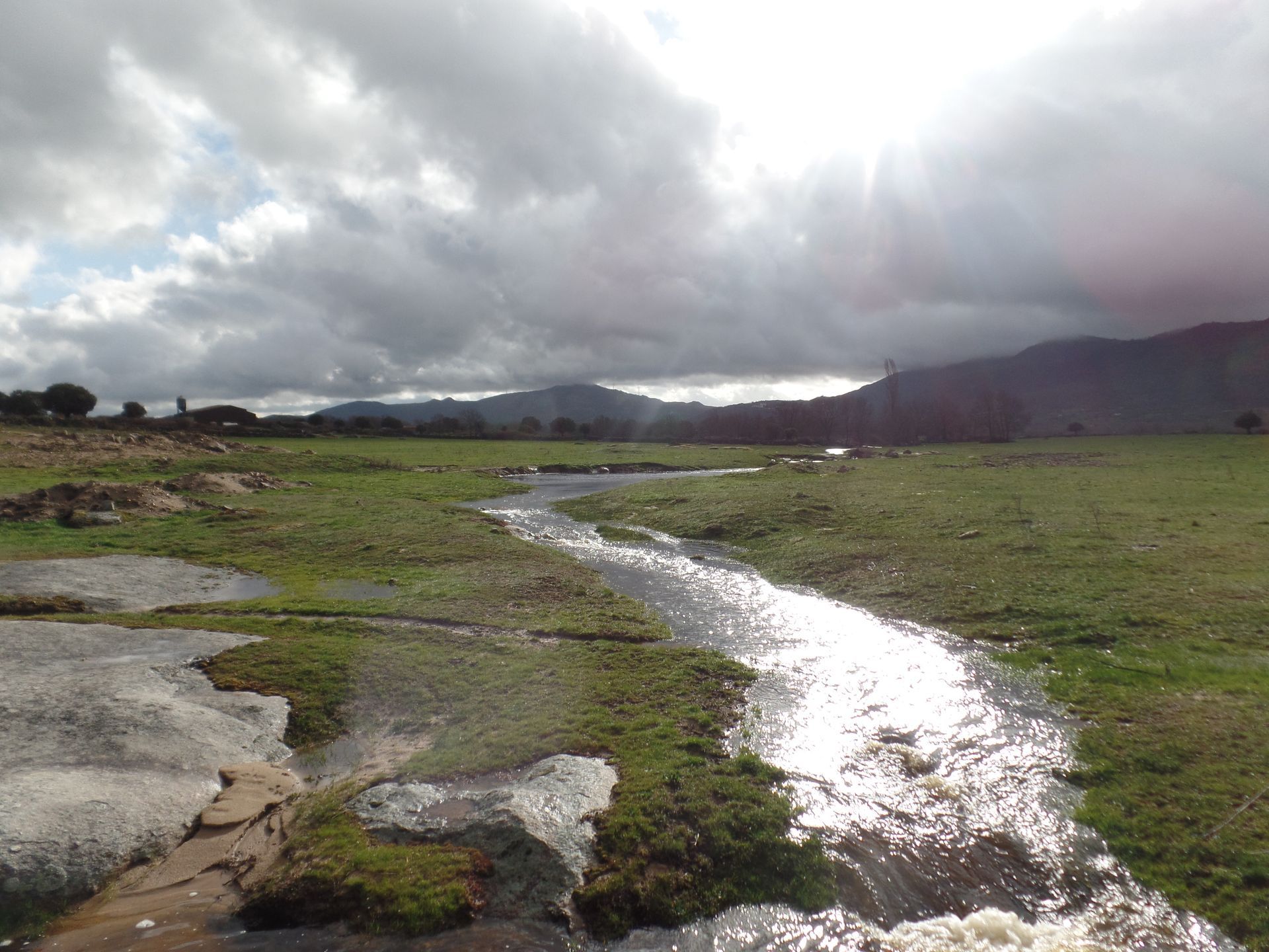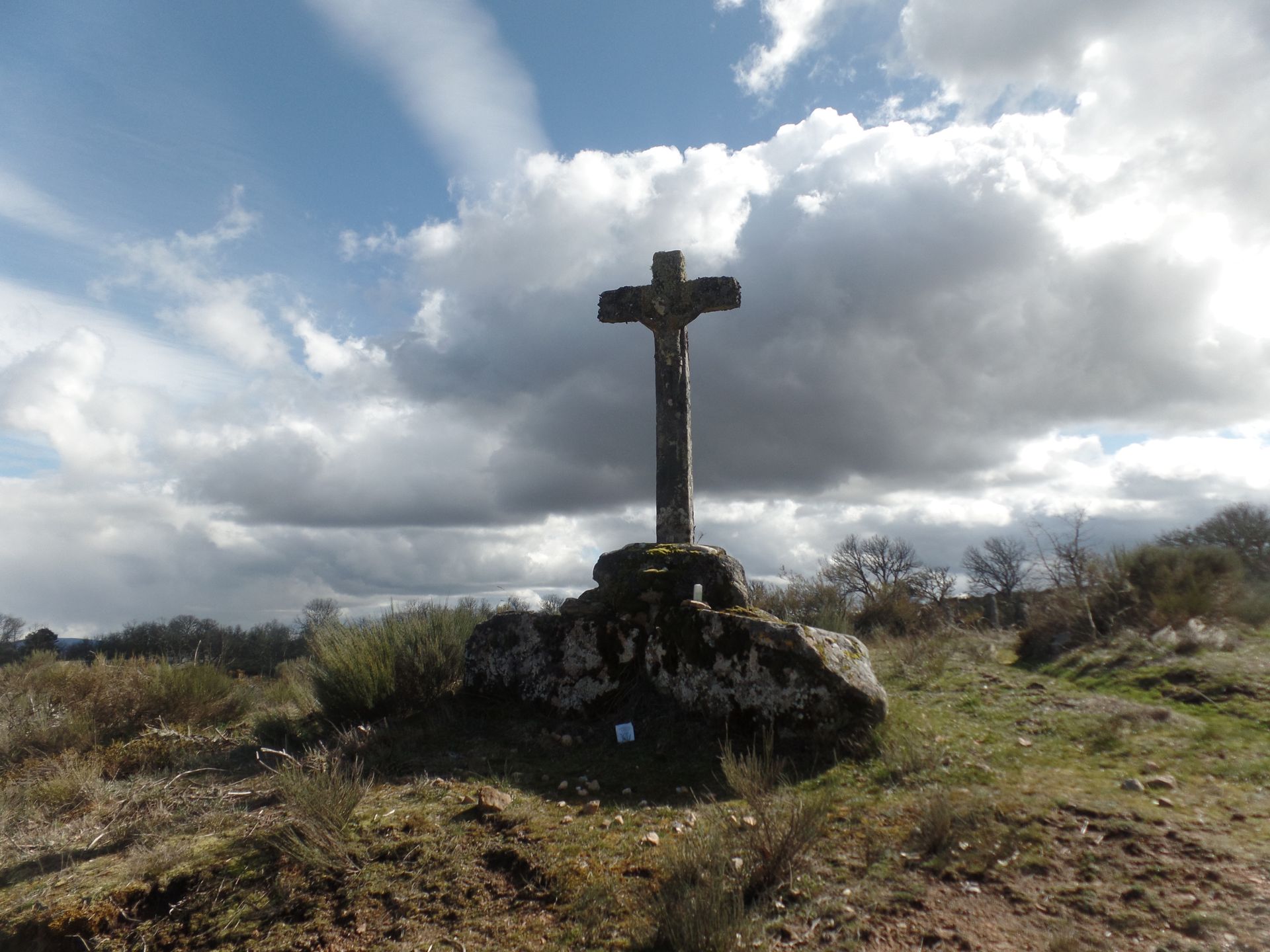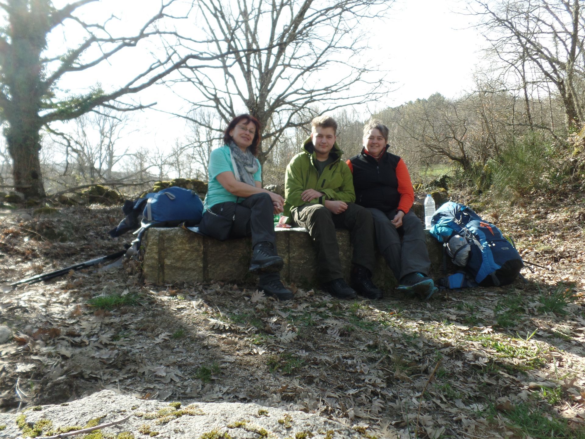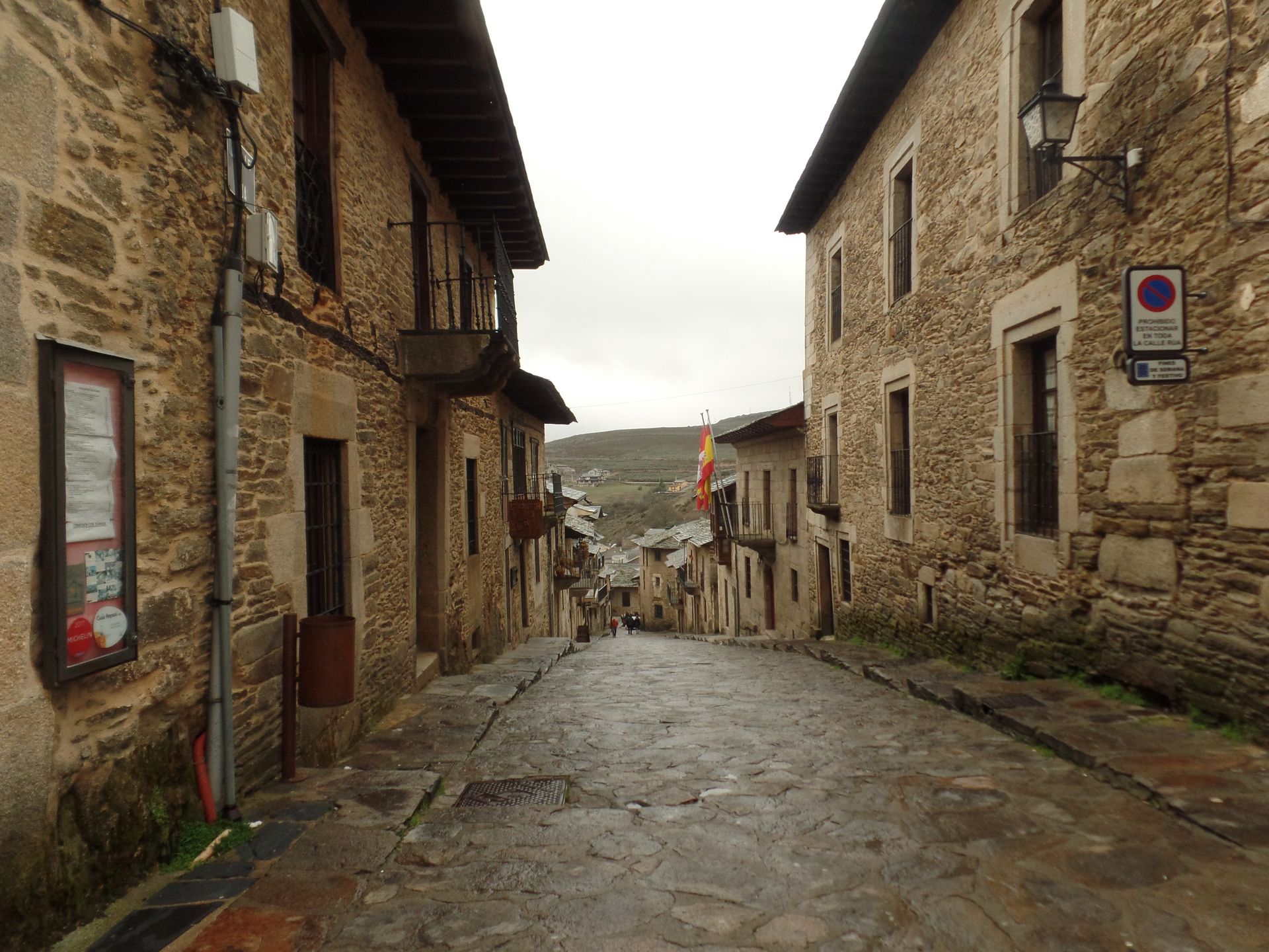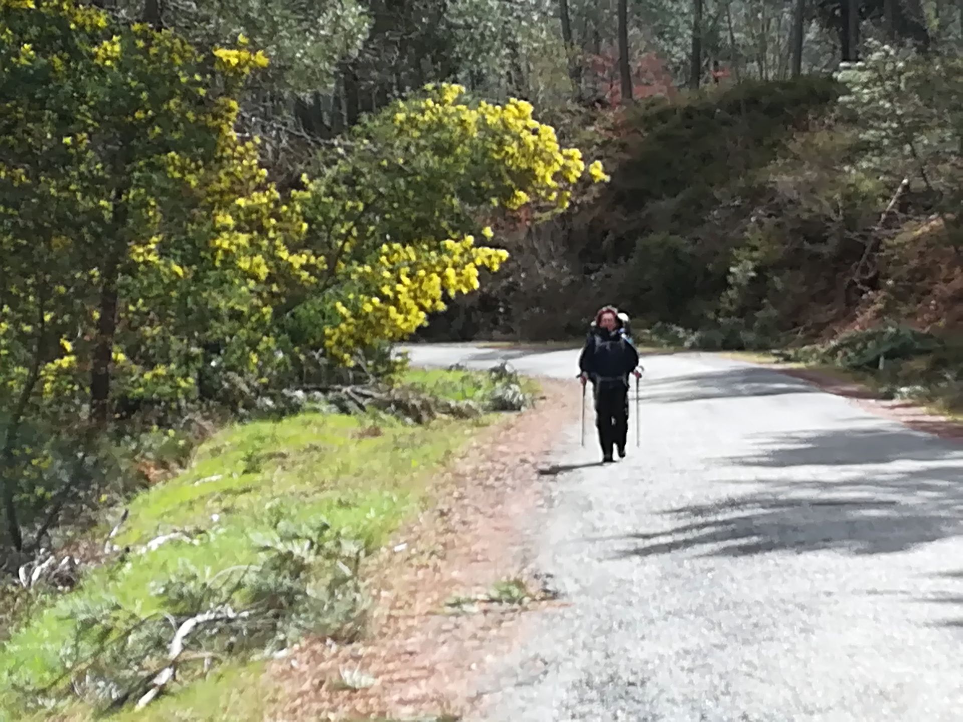 Der Weg führt durch eine wunderschöne Landschaft immerzu bergauf. In der Ferne, hinter den bewaldeten Hügeln, erheben sich im Osten die schneebedeckten Berge der Sierra de Gredos und im Westen die der Sierra de Francia. Wir kommen gut voran auf dem felsigen Untergrund. Zu unserer Rechten gurgelt tief unten im Tal der Rio Cuerpo de Hombres, was übersetzt Männerkörper heißt. Wie dieser Fluss wohl zu dem Namen gekommen sein mag? Eine halbe Stunde bevor wir Calzada de Béjar erreichen, wird der Weg sehr feucht, wir können aber hier auf eine kleine Asphaltstraße ausweichen. Uns kommt eine alte Frau entgegen und Florian, der vorausmarschiert, wird von ihr angesprochen. Auch wenn er sie nicht versteht, bleibt er doch stehen, hört ihr höflich zu und gibt zu verstehen, dass er kein Spanisch spricht. Die alte Frau wendet sich daraufhin an uns und erzählt, dass sie bei Jorge Eier holen will. Vor lauter Begeisterung über unseren jugendlichen Nachwuchspilger vergisst sie aber ihre Eier, kehrt wieder um und begleitet uns ein Stück. Dabei redet sie unaufhörlich auf Flo ein. Auf dem Camino Francés gibt es mittlerweile viele junge Pilger. Der Jakobsweg hat sich dort inzwischen streckenweise fast schon zur Partymeile entwickelt. Gerade die Gegenden um die größeren Städte, allen voran Pamplona, werden von jungen Leuten gerne angesteuert. Doch hier auf der Via da la Plata scheint es eher noch eine Seltenheit zu sein und einen 16jährigen wird man auf keinem der Wege sehr oft antreffen. Als der Weg auf die Passstraße trifft versichert sich die Seniorin, dass wir auch ja gegenüber in den Feldweg einbiegen. Der Abzweig ist zwar überdeutlich markiert, sie wartet aber, bis wir etwa 50 m weit gegangen sind. Dann geht sie auf der Passstraße bergauf weiter. Ihre Eier hat sie wohl endgültig vergessen.