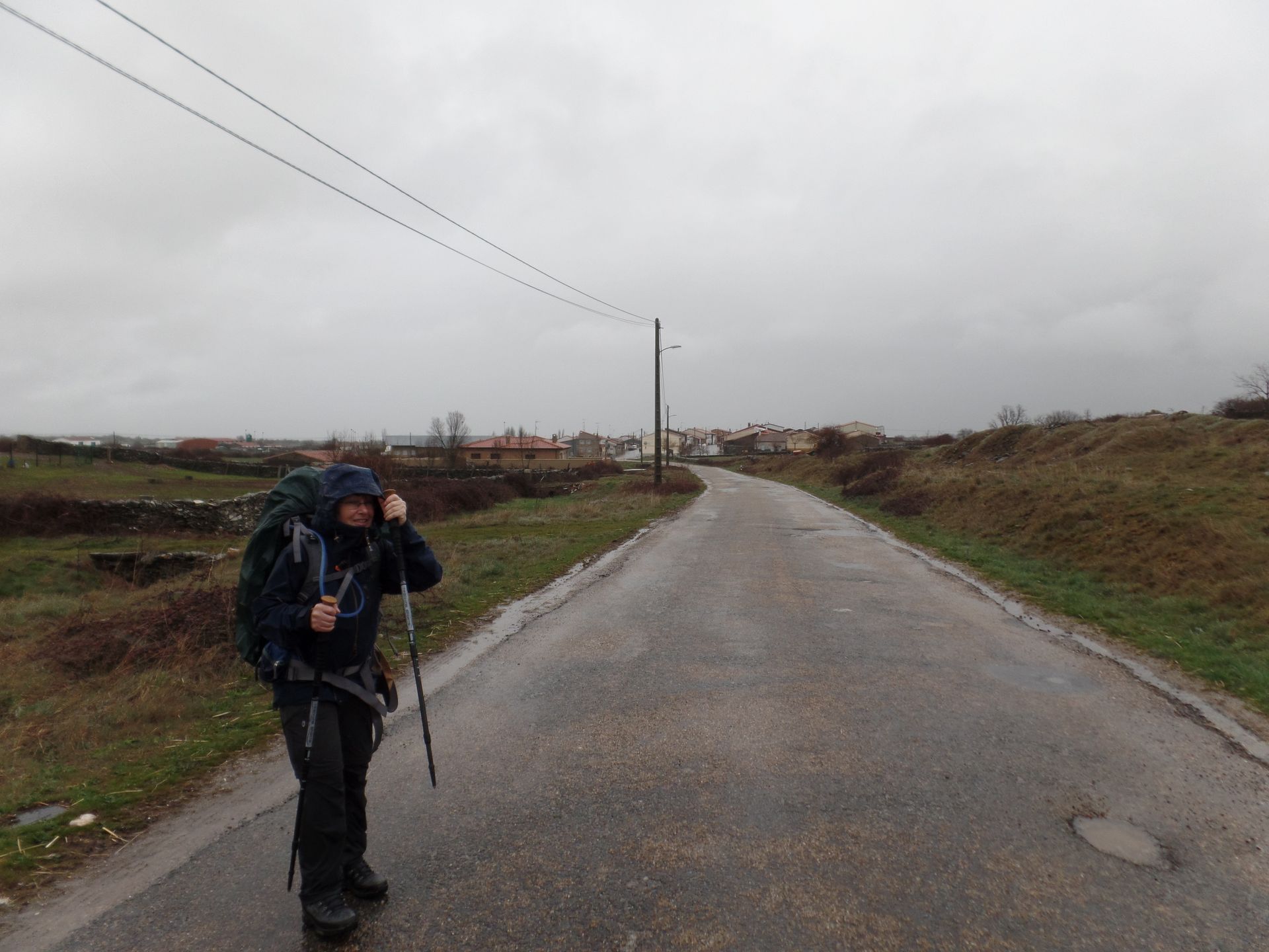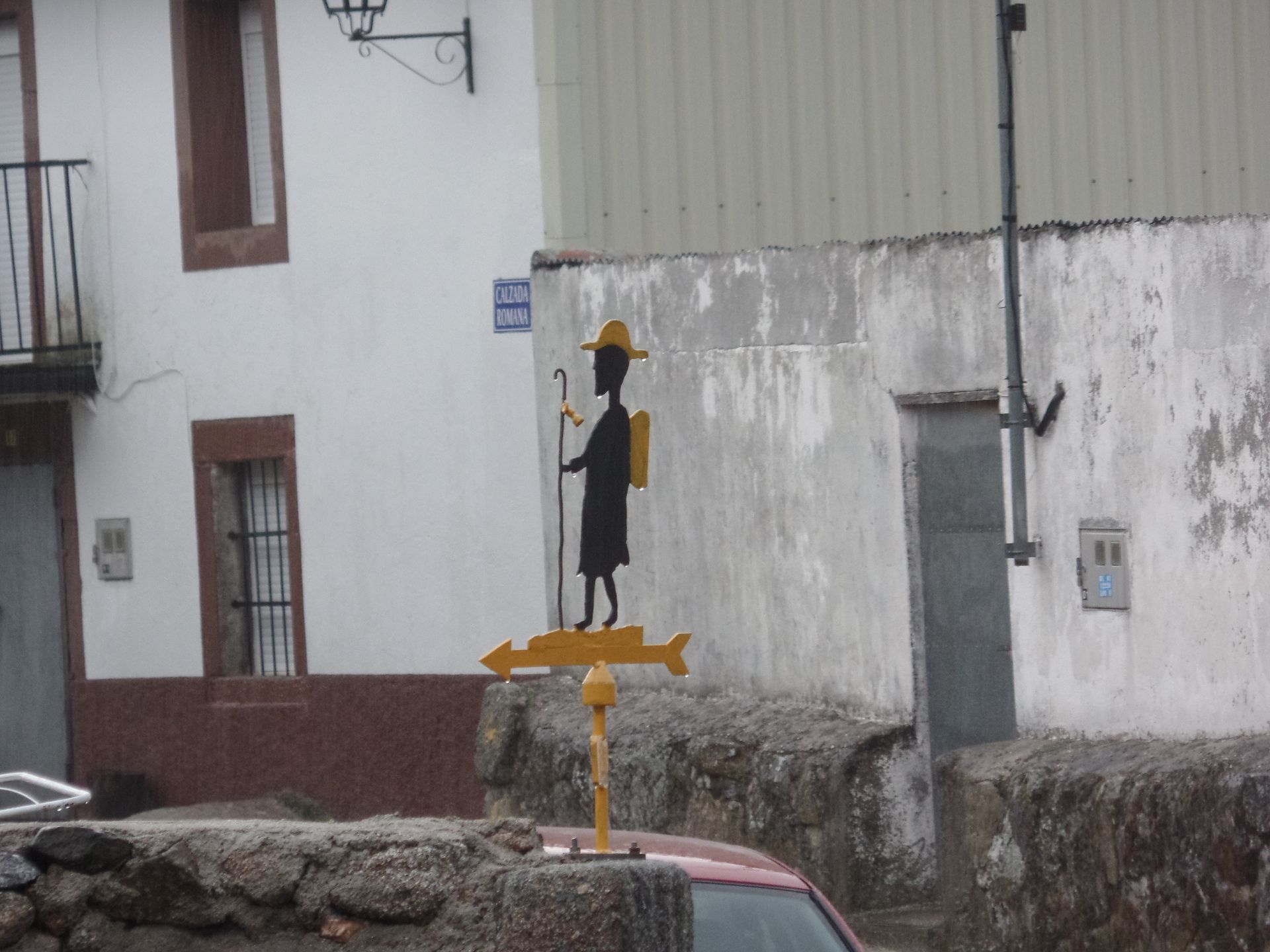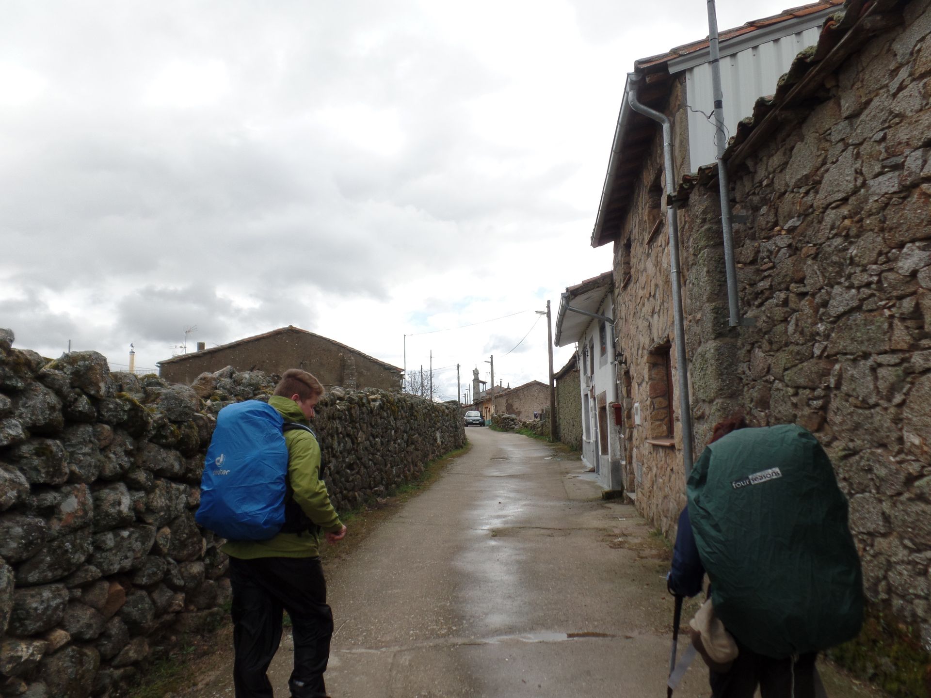 Wir folgen ihm nach einiger Zeit deutlich gemächlicher und beschleunigen unsere Schritte erst, als der Regen stärker einsetzt. Nach etwa einer Stunde klingelt mein Handy. Florian warnt uns vor einer Überschwemmung, bei der es angeblich kein Durchkommen gibt und rät uns, auf der Straße zu bleiben. Er ist mit einem Südafrikaner unterwegs, der auf seinem GPS-Gerät eine sichere Strecke ins Dorf gefunden hat. Mit seinem Begleiter zusammen erreicht er Fuenterroble, doch hat der dort ein Zimmer in einer Pension reserviert. Florian sucht dagegen nach der Herberge. Es folgt ein erneuter Anruf: hier steht vor jedem zweiten Haus ein Stein mit einem Pilger drauf! Dann soll er nach Don Blas fragen! Da wird man ihm schon weiterhelfen! Uns beide erwischt auf den letzten Metern noch ein heftiger Regenguss und wir erreichen die Herberge pitschnass.