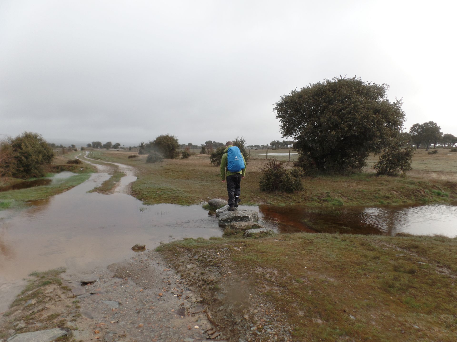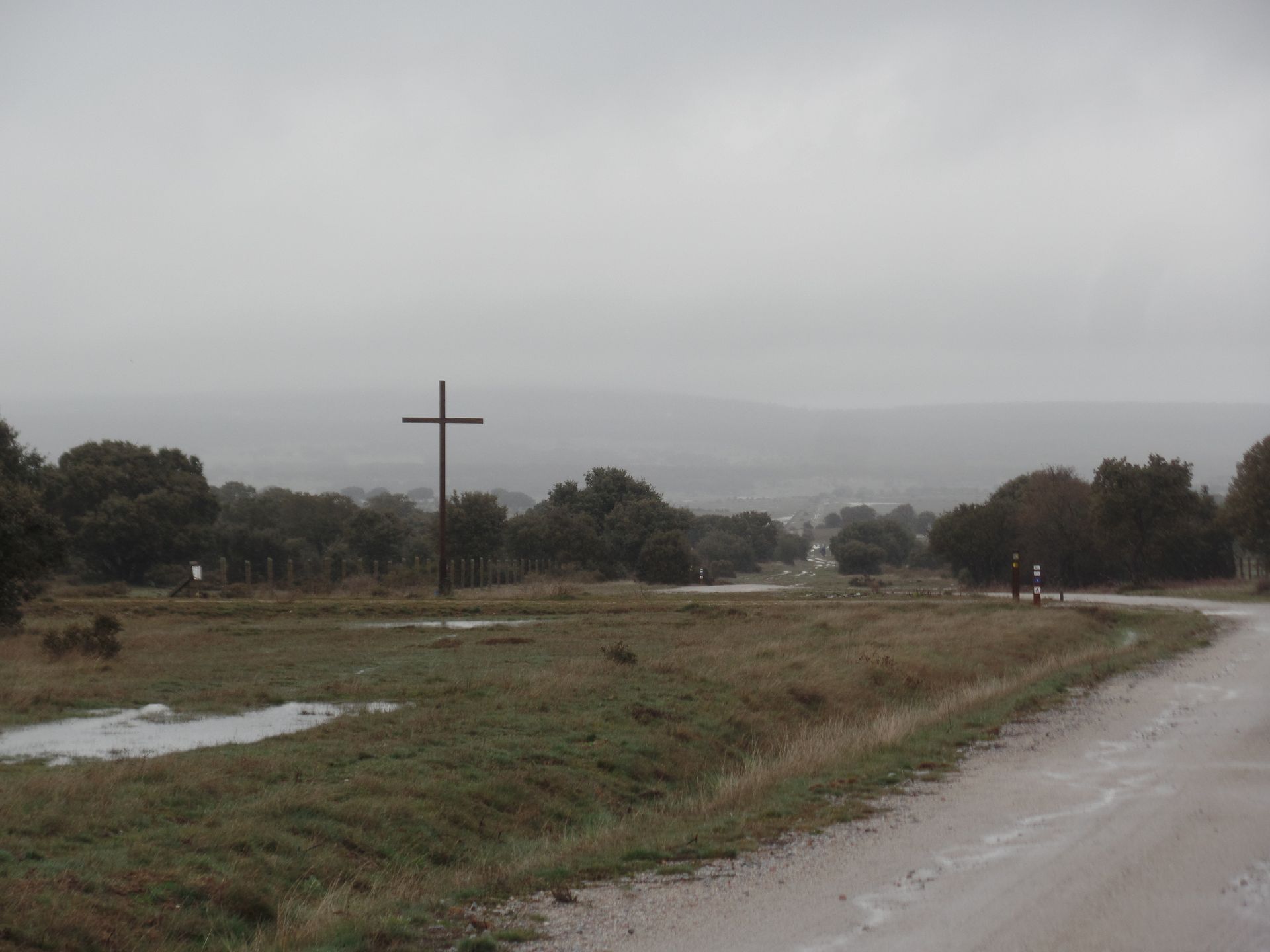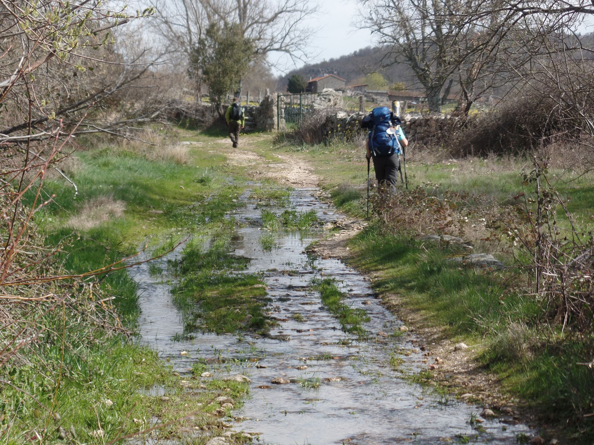 Wir folgen ihm nach einiger Zeit deutlich gemächlicher und beschleunigen unsere Schritte erst, als der Regen stärker einsetzt. Nach etwa einer Stunde klingelt mein Handy. Florian warnt uns vor einer Überschwemmung, bei der es angeblich kein Durchkommen gibt und rät uns, auf der Straße zu bleiben. Er ist mit einem Südafrikaner unterwegs, der auf seinem GPS-Gerät eine sichere Strecke ins Dorf gefunden hat. Mit seinem Begleiter zusammen erreicht er Fuenterroble, doch hat der dort ein Zimmer in einer Pension reserviert. Florian sucht dagegen nach der Herberge. Es folgt ein erneuter Anruf: hier steht vor jedem zweiten Haus ein Stein mit einem Pilger drauf! Dann soll er nach Don Blas fragen! Da wird man ihm schon weiterhelfen! Uns beide erwischt auf den letzten Metern noch ein heftiger Regenguss und wir erreichen die Herberge pitschnass.