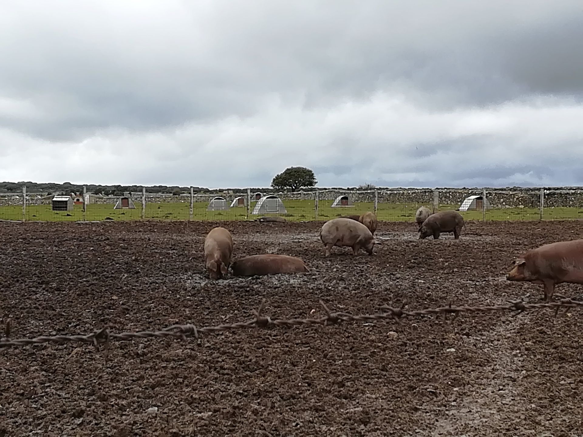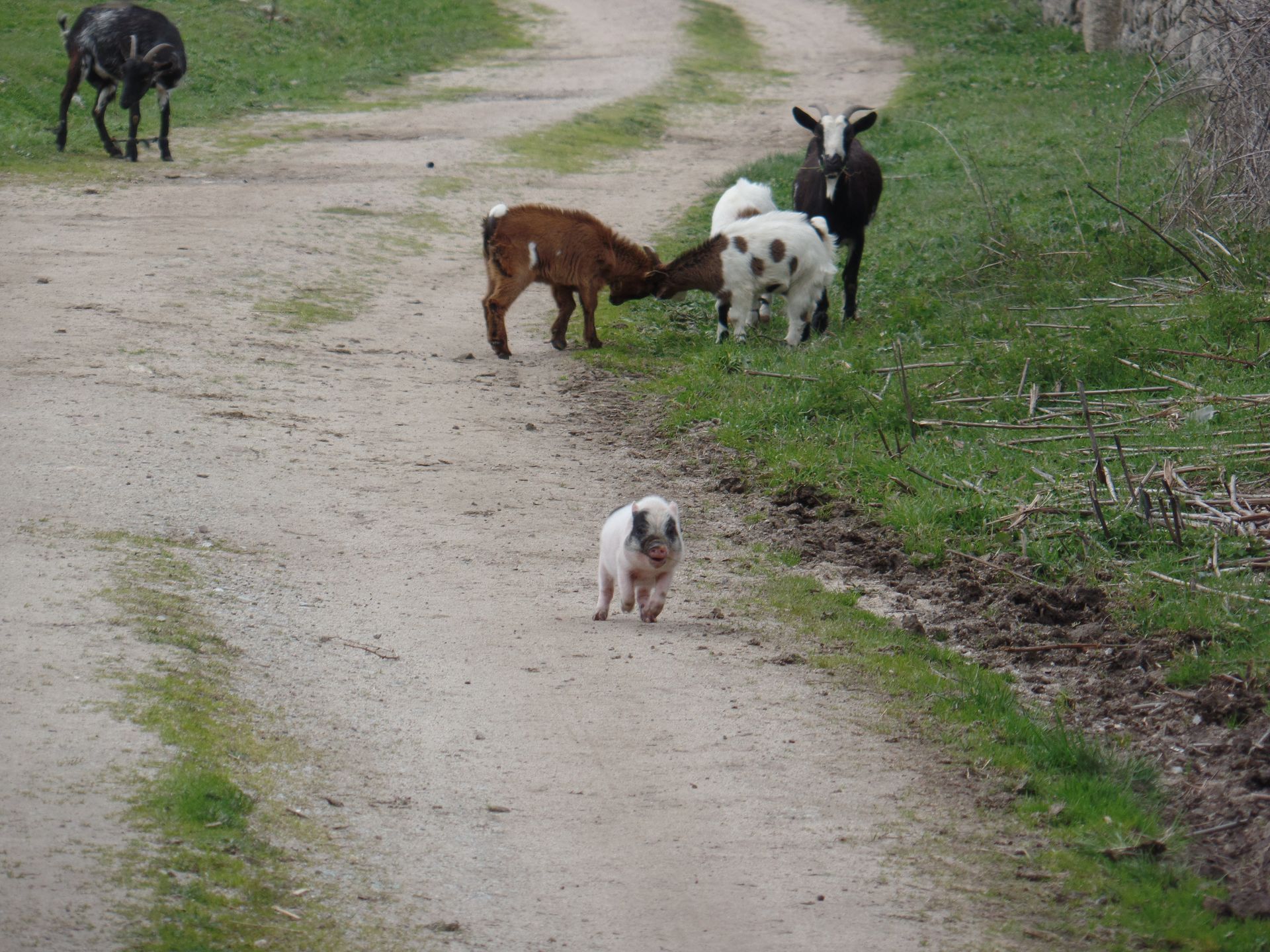 Gleich bei dem ersten Haus des Dorfes handelt es sich um die Pilgerherberge „Alba y Soraya“. Die Herbergsmutter, die uns überschwänglich begrüßt, heißt aber weder Alba noch Soraya, sondern Manuela. Als sie unsere Pilgerausweise studiert und feststellt, dass sie am gleichen Tag Geburtstag hat, wie Roswitha, deren Namen sie in die spanische Form „Rosita“ abwandelt, ist sie ganz aus dem Häuschen. Wir erledigen gleich das Pflichtprogramm, also Wäsche waschen und aufhängen, Bett beziehen und duschen. Heute wasche ich die Socken des Jungpilgers noch mit, ab morgen muss er das selbst machen. Danach machen wir uns auf in die Dorfkneipe auf ein Menú del Día und ein Bier. Flo habe ich weißgemacht, dass man in Spanien Bier erst ab 18 trinken darf und, dass die Spanier da sehr streng sind. Vorerst glaubt er es noch! Nach dem Essen marschiert er zurück zur Herberge, wir beide machen noch einen kleinen Verdauungsspaziergang durchs Dorf. Dabei lernen wir einen Mann kennen, der mit seinen Ziegen und Schweinen spazieren geht. Er ist angeblich 87 Jahre alt und offeriert sich uns als rüstigen Rentner auf Frauensuche. Da tun sich ja gleich am ersten Tag Chancen auf, mit denen wir gar nicht gerechnet hätten!