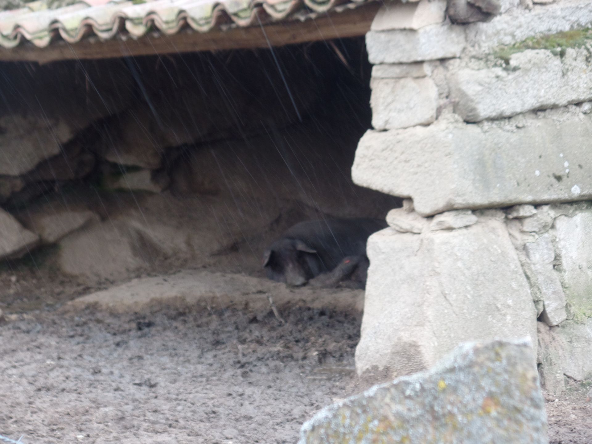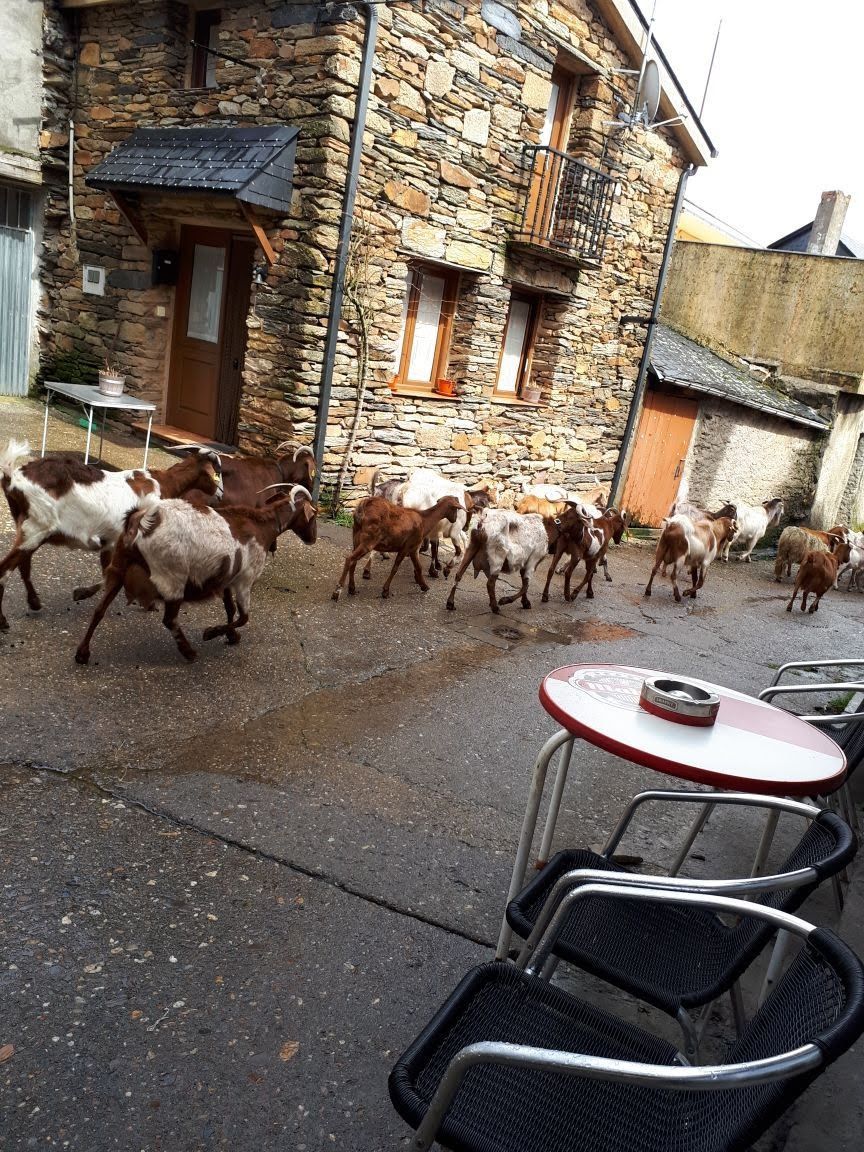 In Campobecerros steuern wir zuerst die Bar Rosario an, in der man sich für eine Übernachtung in der Herberge anmelden muss. Dort treffen wir die Französin wieder und während wir uns erst einmal einen Kaffee gönnen, kommt Geißenpeter von der Alm herunter und treibt seine Herde Ziegen durchs Dorf. Eine jede weiß, wo sie abbiegen muss, um den heimatlichen Stall zu finden. Bald darauf kommt der Metzger mit einem großen Eimer auf den Dorfplatz, pfeift laut und durchdringend und wirft den herbeieilenden Hunden ihr abendliches Futter vor die Füße.