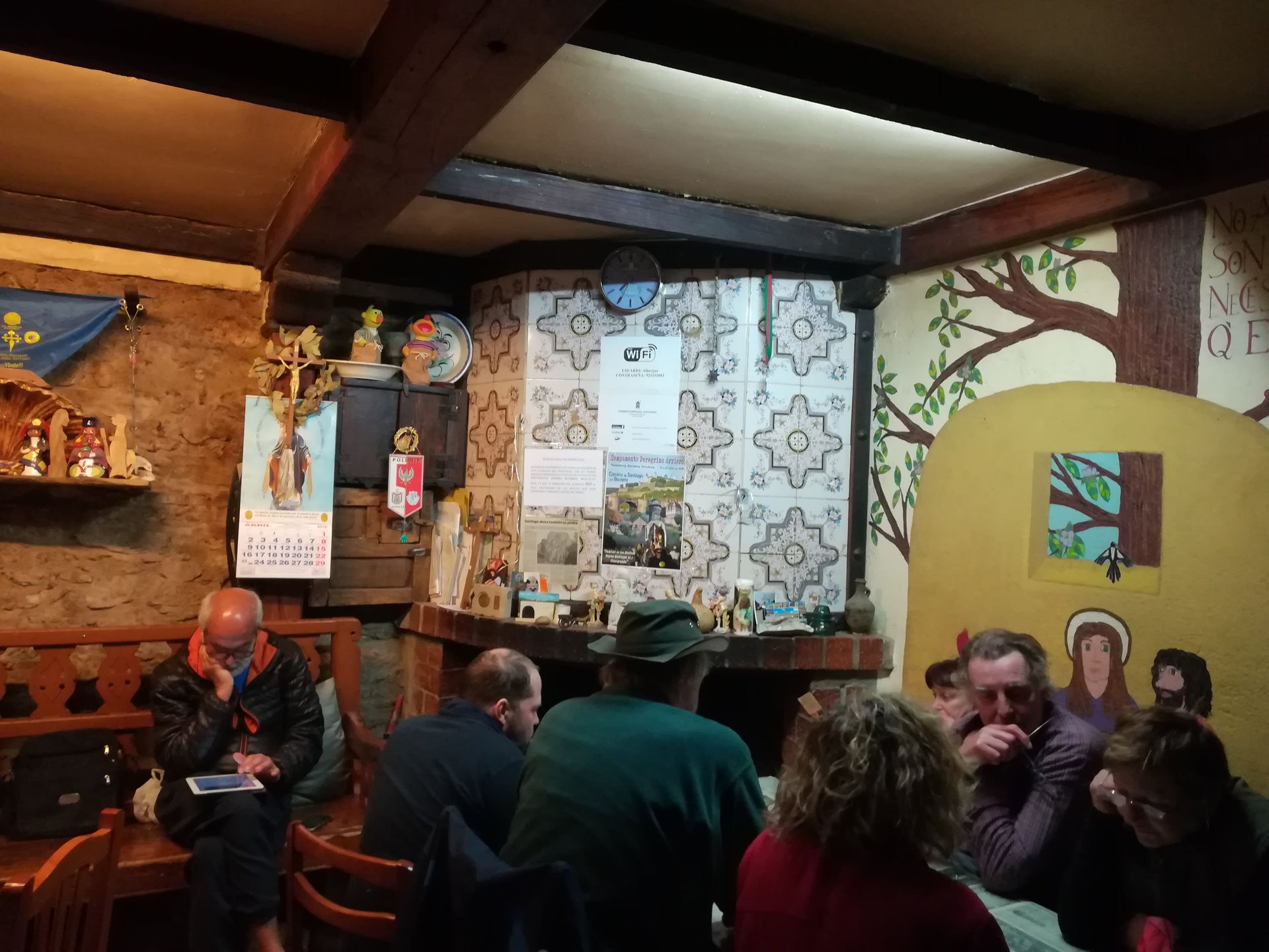 Es gibt in der Herberge nur den Schlafraum und die Duschen, keine weitere Sitzgelegenheit, weshalb wir uns den Rest des Tages in der Bar Rosario am Dorfplatz aufhalten. Die Bar ist offenbar das Wohnzimmer des ganzen Dorfes. In der Mitte steht ein Holzofen und alle sitzen drumherum. In der Ecke neben der Tür sitzt eine alte Frau, den Fotos an den Wänden nach zu urteilen, ist oder war sie mal die Besitzerin der Bar. Sie war mal eine sehr schöne Frau. Jetzt sitzt sie scheinbar teilnahmslos in ihrem Eck und rührt sich kaum. Doch manchmal blitzen ihre Augen, wie in Erinnerung längst vergangener Tage. Zum Abendessen werden wir in eine andere Bar geschickt und es sieht so aus, als ob alle Besucher mit uns zusammen das Lokal wechseln. Wir werden auch in der zweiten Bar wieder von den gleichen Personen bedient und man setzt uns einen Eintopf vor, der zum Glück weitaus besser schmeckt als er riecht. Es kostet mich große Überwindung diesen Eintopf überhaupt zu probieren!