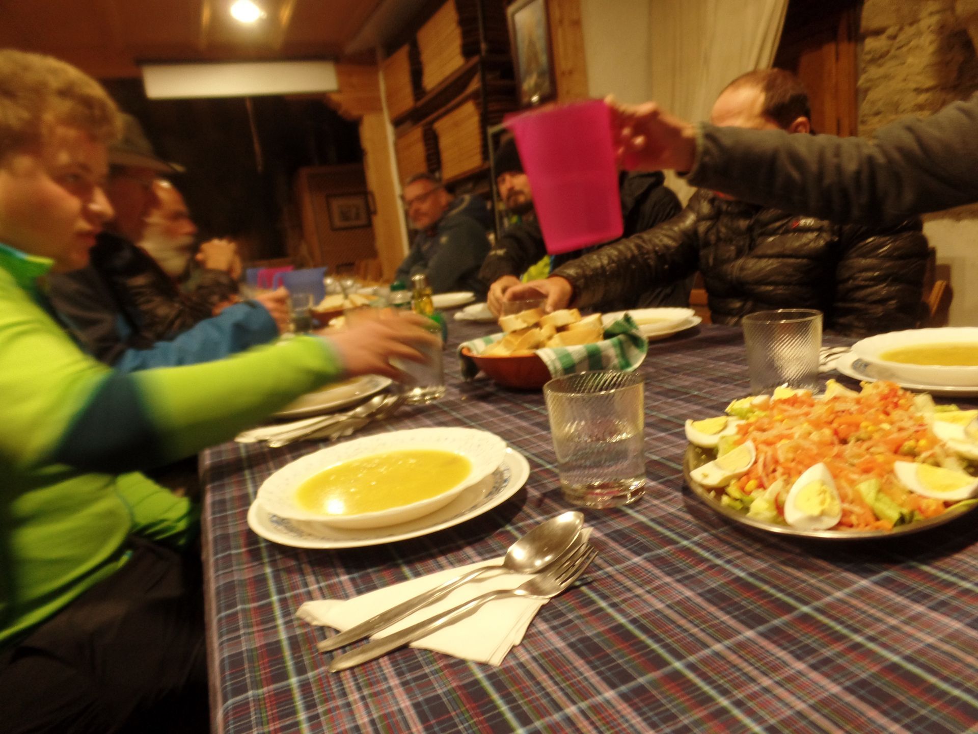 Zum Abendessen treffen wir uns alle im Speisesaal. Es ist bitterkalt dort und das Essen spottet jeder Beschreibung. Suppe und Salat sind zwar okay, aber an den sogenannten Spareribs ist fast kein Fleisch und das wenige, was dran ist, ist kalt und roh. So kuscheln wir uns nach dem Essen nicht nur frierend, sondern auch hungrig in unsere Schlafsäcke. Die Nacht wird wie erwartet stickig und stinkig, während der Regen unaufhörlich gegen die Fenster prasselt.