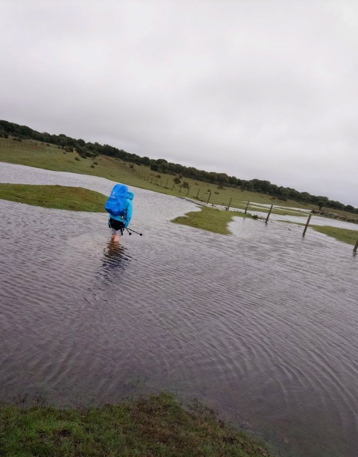 Der Tag beginnt, wie er gestern endete: kalt und nass! Die erste Hochebene liegt vor uns und wir werden heute den Pico Dueño besteigen. Regen und trockene Perioden wechseln einander ab. Hin und wieder lugt auch einmal eine trübe Sonne zwischen den Wolken hervor. Kurz nach Verlassen des Dorfes biegt der Weg von der Asphaltstraße ab und führt ab jetzt auf einem breiten Grasstreifen über eine weite Ebene. Rinderweiden, soweit man schauen kann, der Horizont verschwindet in Nebel und Wolken. Der einzige Halt für das Auge sind die Weidezaun-Pfosten rechts und links des Weges. Die Regenpfützen lassen sich anfangs noch auf großen Feldsteinen trockenen Fußes überqueren, doch irgendwann ist Schluss mit lustig. Die Überschwemmung reicht über den Weg hinaus bis weit in die Weiden hinein. Der Zaun lässt sich, da Stacheldraht, nicht überwinden und es würde eh nichts bringen. Jetzt heißt es Schuhe und Strümpfe ausziehen und hindurchwaten. Ich gehe voran und suche die beste Stelle für die Durchquerung, an der mir das Wasser locker bis über die Knie reicht. Die Hose bleibt bei Florian und mir zum Glück trocken. Roswitha ist leider um einiges kleiner als wir beide! Doch glücklicherweise findet sie eine bessere Furt als ich.