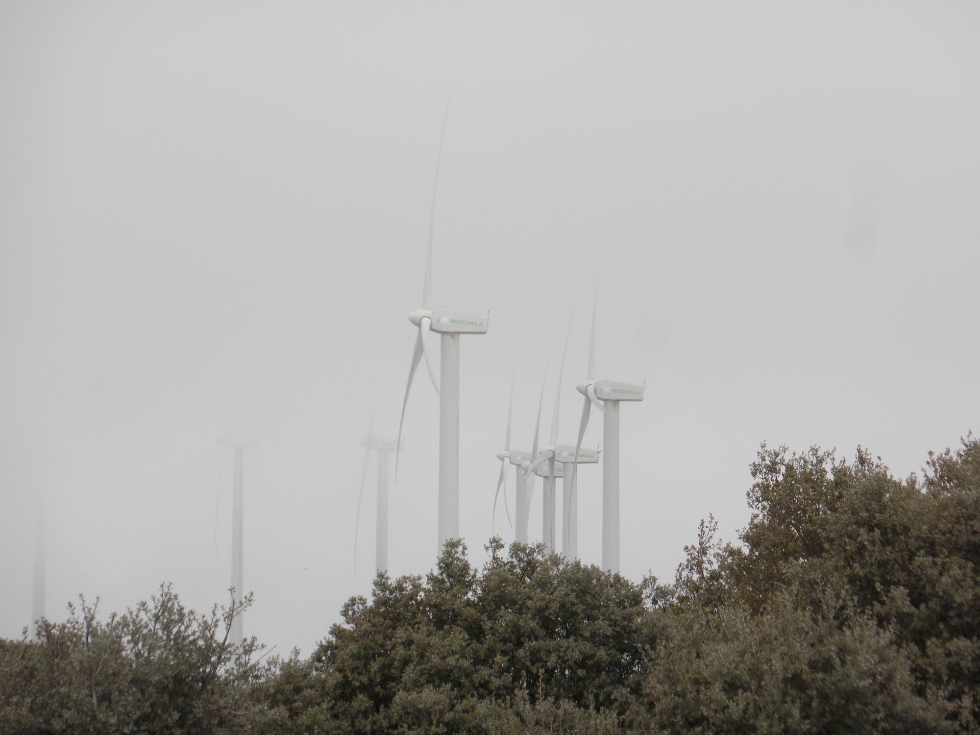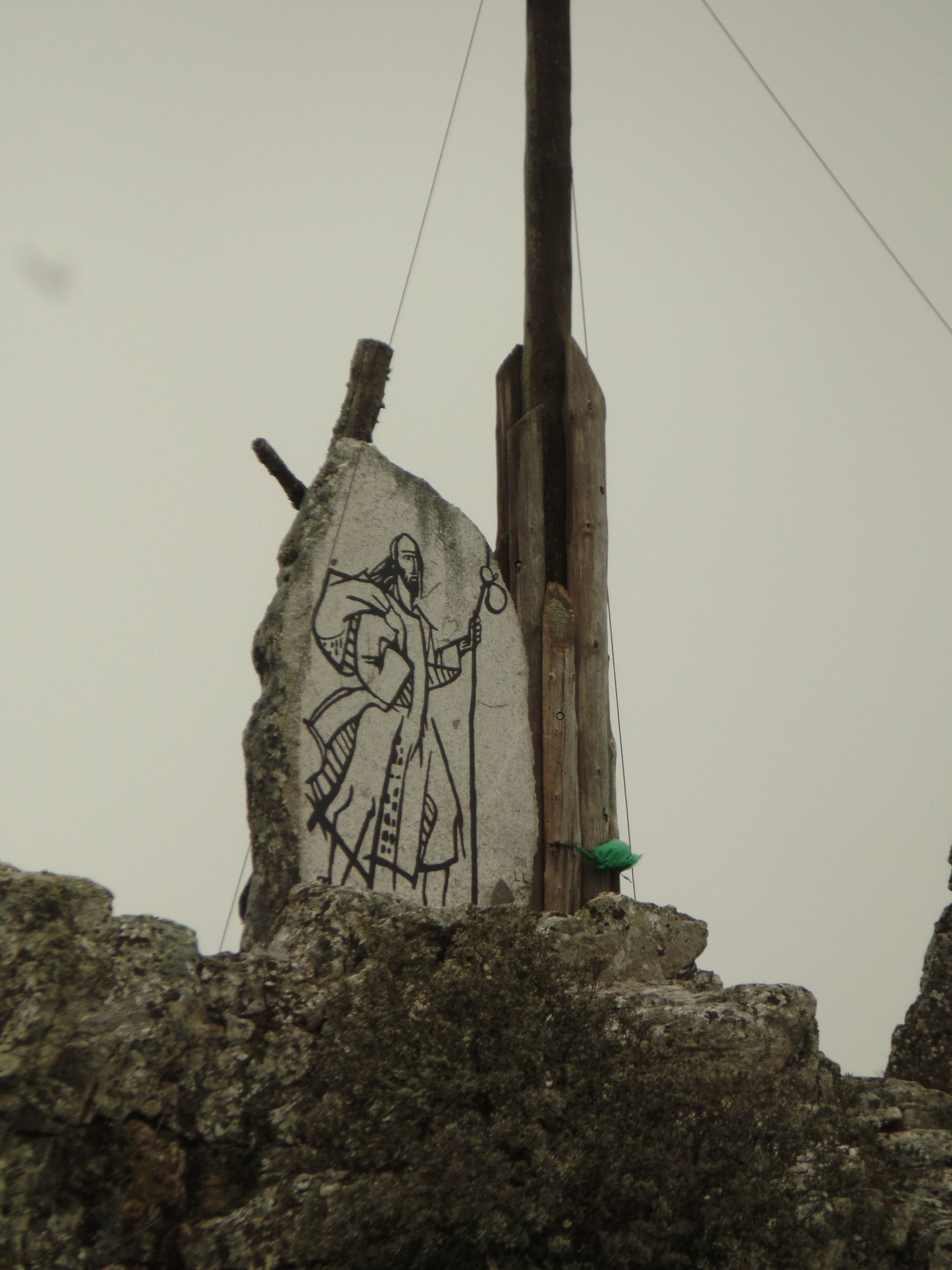 Den „Berg“ sehen wir auch als wir zum Aufstieg ansetzen noch nicht. Der Weg zum „Gipfel“ zieht sich in die Länge. Dadurch ist der Aufstieg zwar nicht steil, aber dennoch sehr ermüdend. Nach zwei Stunden erreichen wir die ersten Windkrafträder, von denen wir im Laufe der nächsten Stunde wohl an die 50 Stück passieren. Der Nebel lichtet sich etwas und wir sehen unten im Tal mehrere große Fincas und wieder riesige Weiden, diesmal mit Schweinen drauf. Oben gibt es dann sogar ein richtiges Gipfelkreuz und eine Jakobusstatue. Der Abstieg ins Tal ist dann doch recht steil und anstrengend und meine gebrochenen Zehen machen sich erstmals bemerkbar.