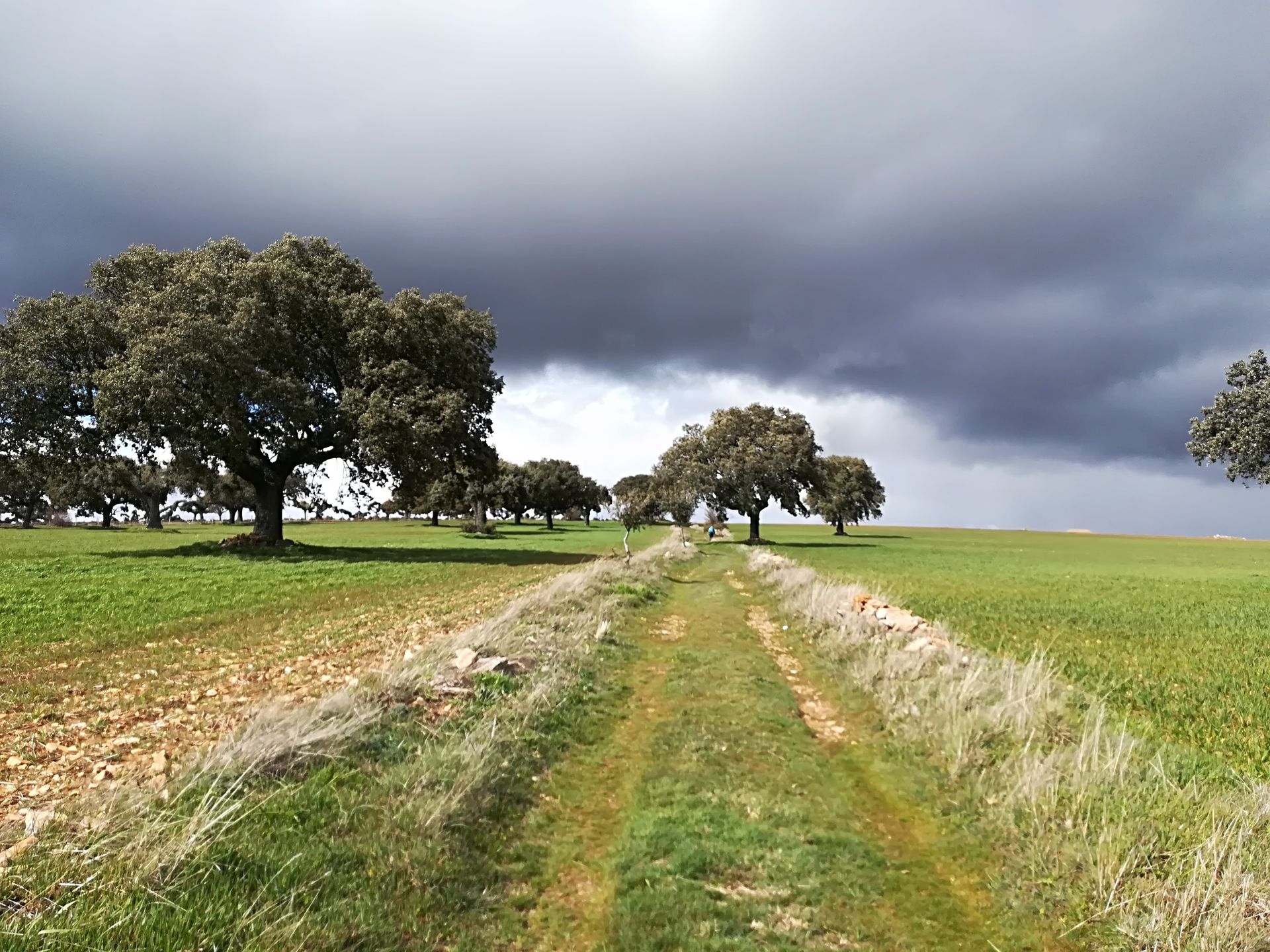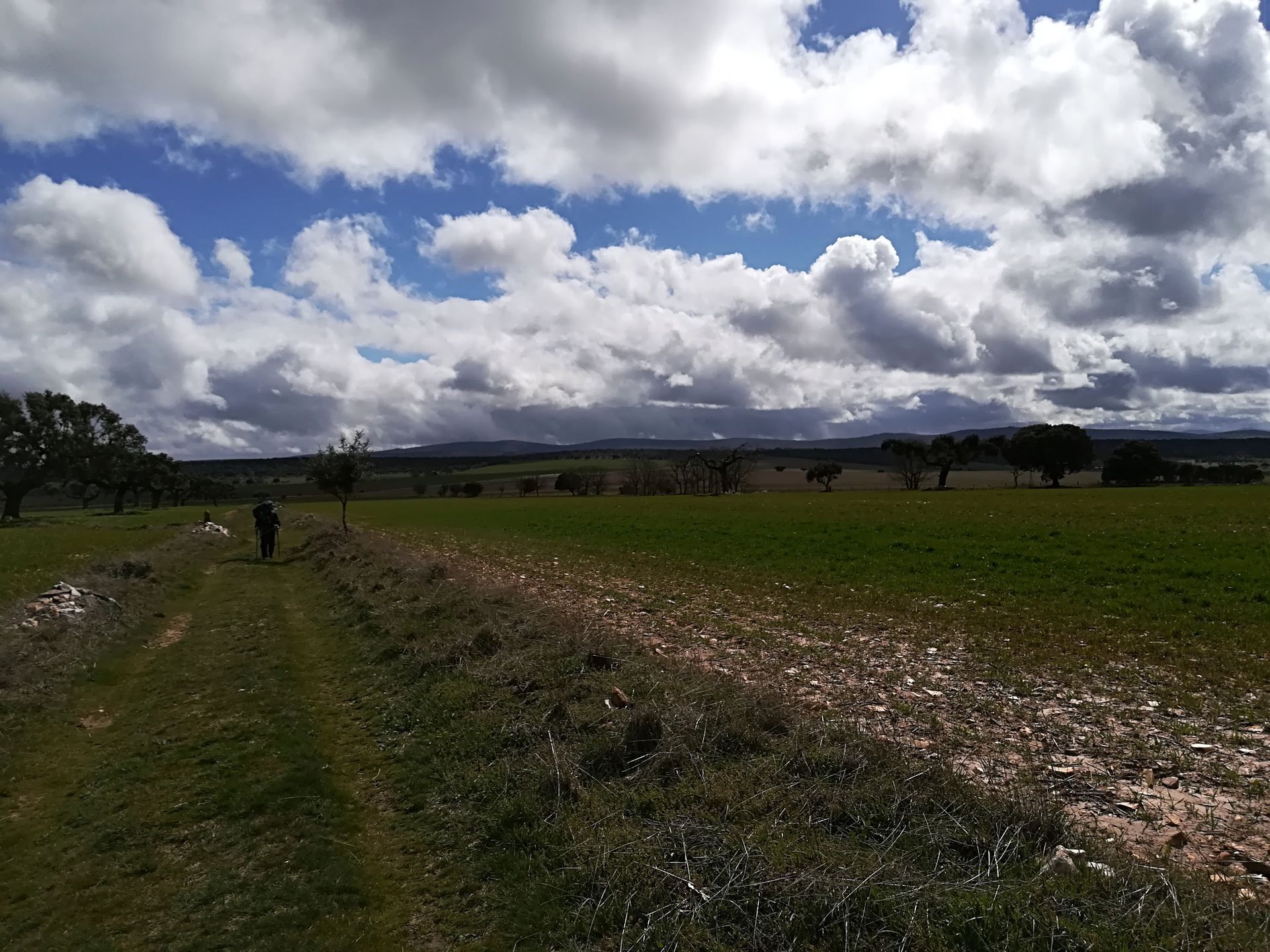 Am späten Nachmittag hört der Regen ganz auf und der Himmel belohnt uns mit einer einzigartigen Stimmung. Wir verlassen den markierten Weg und biegen auf einen Feldweg ins zwei Kilometer entfernte San Pedro ein. Kurz bevor wir in San Pedro ankommen, knicke ich mit dem linken Fuß um. Irgendwas verhakt sich dabei, nach ein paar Schritten geht es aber wieder. Die Pension finden wir schnell und die freundliche Wirtin zeigt uns unsere Zimmer, stopft unsere schmutzige Wäsche in die Waschmaschine und klärt Florian später nicht nur darüber auf, dass man in Spanien sehr wohl auch unter 18 ein Bier trinken darf. Sie übt sogar mit ihm, wie man auf Spanisch ein Bier bestellt! Der Blick, den ich daraufhin von ihm ernte, spricht Bände! Die Zimmer sind gut, das Wasser im Bad ist richtig heiß, nur die Heizung im Zimmer von Roswitha und mir ist kaputt. Wir bekommen aber einen Öl-Radiator zur Verfügung gestellt.