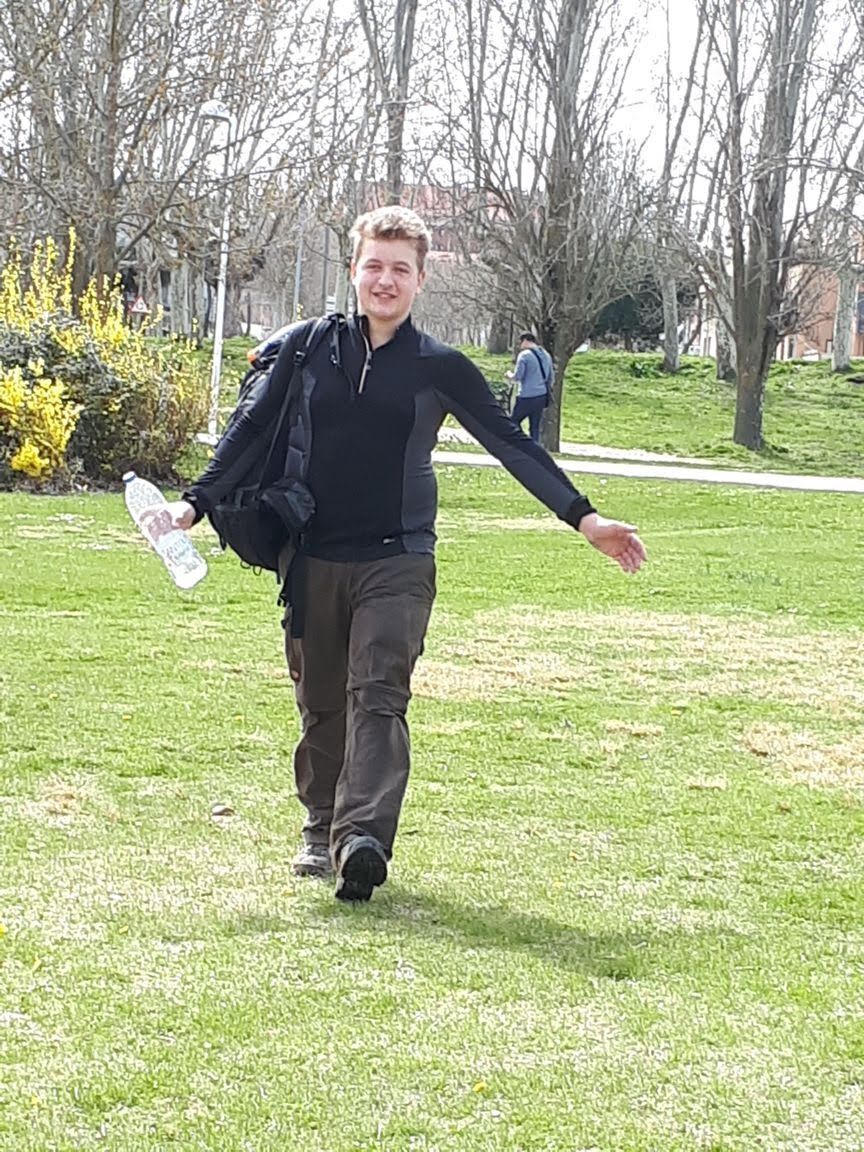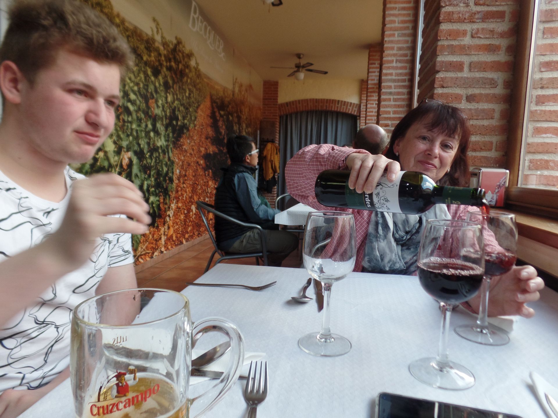 Wir warten noch nicht lange an der Brücke, als der nächste Anruf kommt. Leicht panisch teilt mir der Jungpilger mit, dass er sich erneut verlaufen hat. Er findet keine Pfeile mehr. Ich frage ihn nach dem Namen der Straße, in der er sich augenblicklich befindet und erfahre den Namen des Hotels, vor dem er steht. Via Telefon und Google Maps lotse ich ihn die paar Meter zum Fluss und sehe ihn nach nur wenigen Sekunden. Winkend kommt er auf uns zu, die leere 2-Liter-Wasserflasche in der Hand, fällt mir um den Hals und sagt: „So, jetzt könnt ihr mich mal!“ Wenigstens hatte er für seinen letzten Pilgertag richtig gutes Wetter mit strahlendem Sonnenschein und deutlich höheren Temperaturen als in den vergangenen Tagen und als Belohnung bekommt er auf einem der vielen schönen Plätze ein großes kühles Bier und eine ordentliche Portion Paella. Kurz ist er noch einmal irritiert als plötzlich die Polizei hinter ihm auftaucht, doch dann zischt das Bier die ausgetrocknete Kehle hinunter.