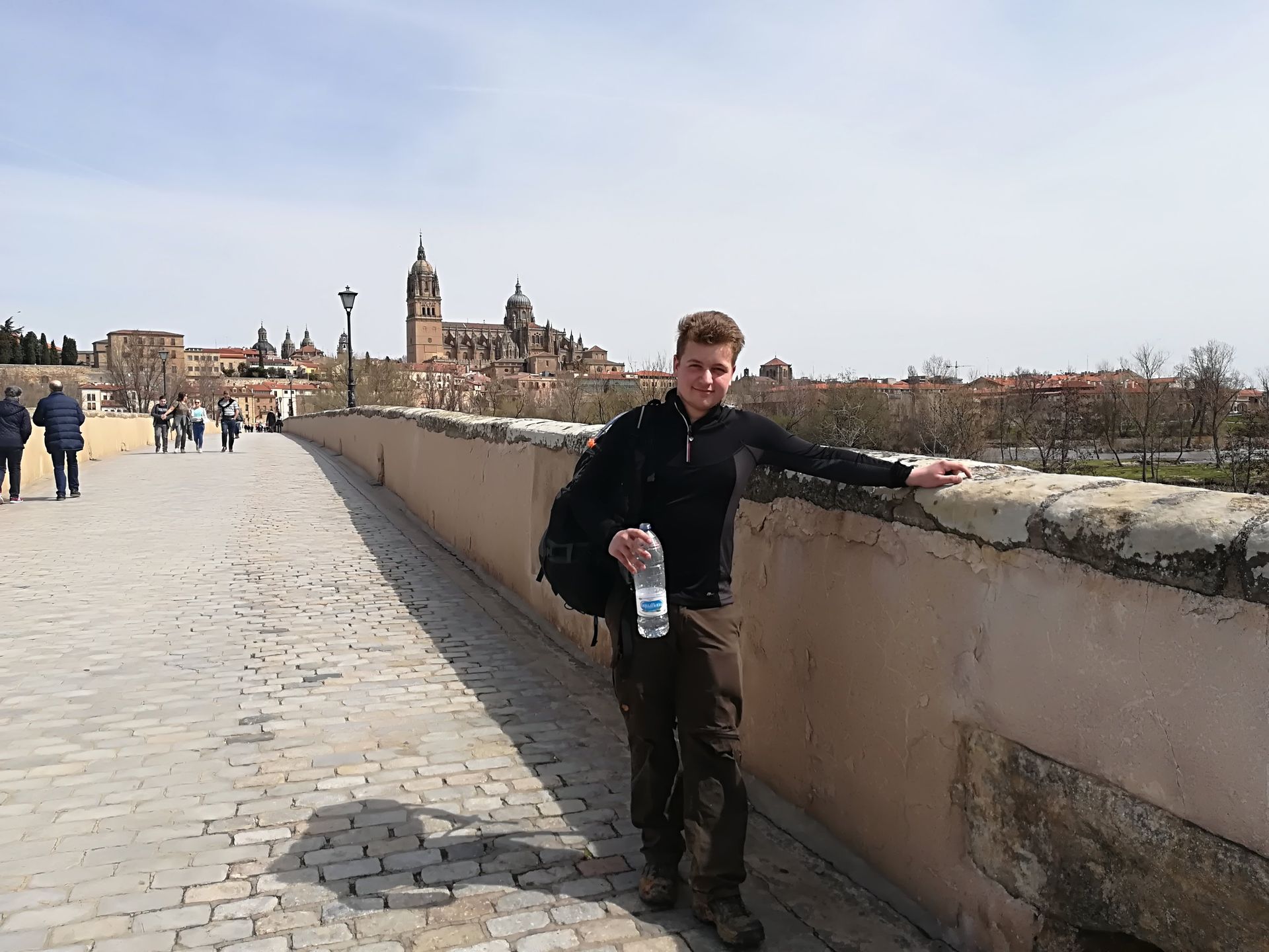 Während wir uns mit Kaffee und Kuchen die Zeit vertreiben und die Kirche San Marcos besichtigen, die mit ihrem kreisrunden Grundriss zu den Besonderheiten Salamancas gehört, wandert unser Nachwuchspilger zunächst einmal zwei Kilometer in die falsche Richtung. Schließlich kommen ihm die ersten Pilger entgegen und weisen ihm den rechten Weg. Dadurch verlängert sich seine Tagesetappe von 22 auf 26 km. Trotzdem erhalte ich nach nicht ganz vier Stunden von ihm einen Anruf, in dem er mitteilt, dass es kurz vor Salamanca ist und wir uns zum vereinbarten Treffpunkt, der Puente Romano, begeben sollen.