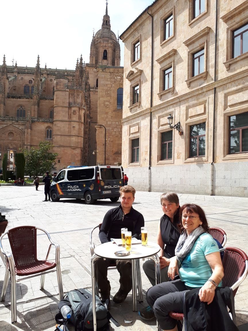 Den Nachmittag verbringen wir getrennt. Roswitha und ich schauen uns Salamanca von oben und unten an, Flo verbringt die nächsten Stunden im Bett und zieht dann allein durch die Stadt. Für die Kathedrale habe ich Eintrittskarten, doch deren Besuch habe ich Florian freigestellt. Um so mehr überrascht es mich, ihn zum Besichtigungstermin bereits auf den Stufen der Kathedrale anzutreffen. Den Abend lassen wir in einer Bar ausklingen und begleiten den „Wahren Pilger“ schließlich in die Unterkunft. Das Pilgern zu dritt ist hiermit beendet!
