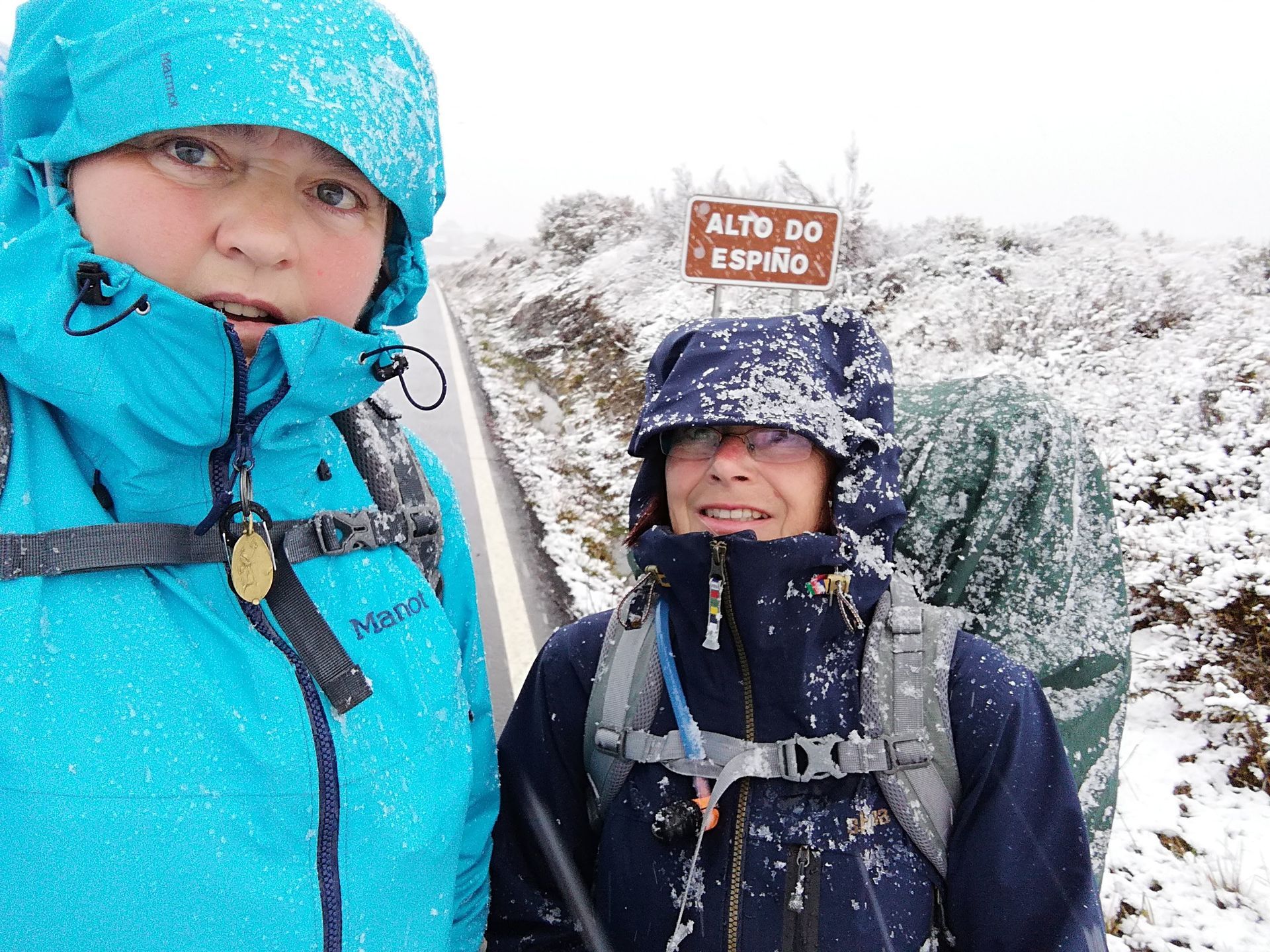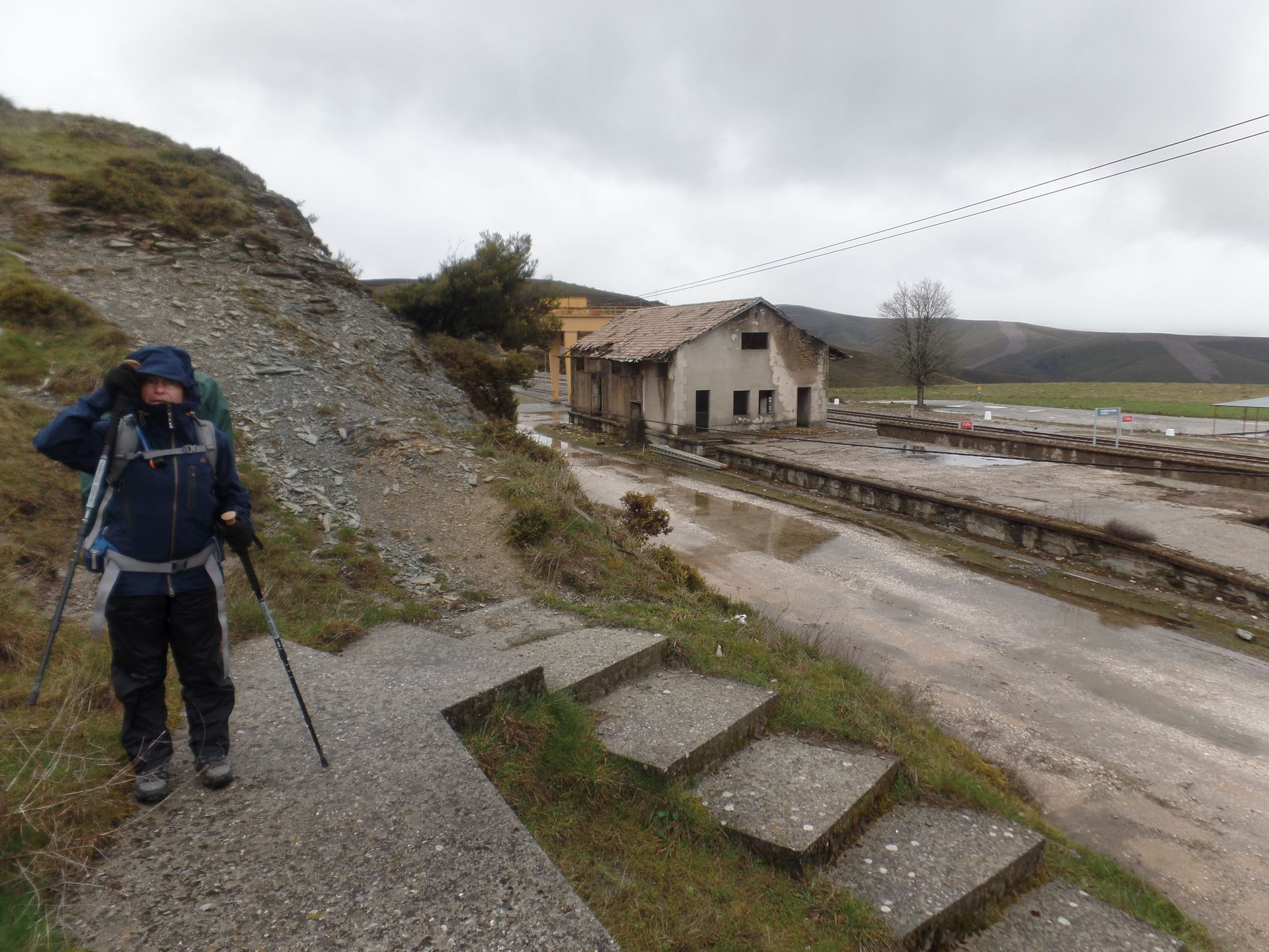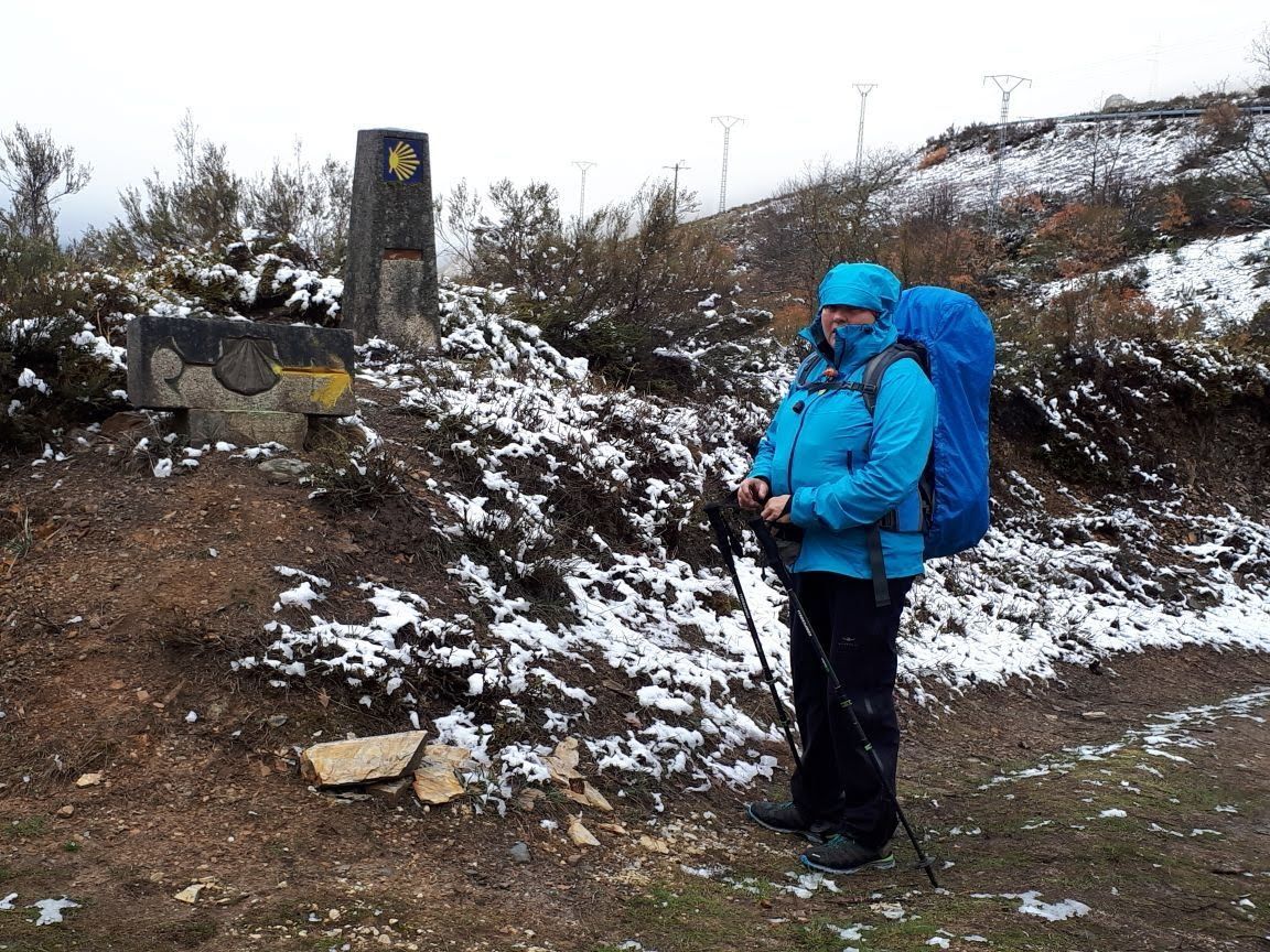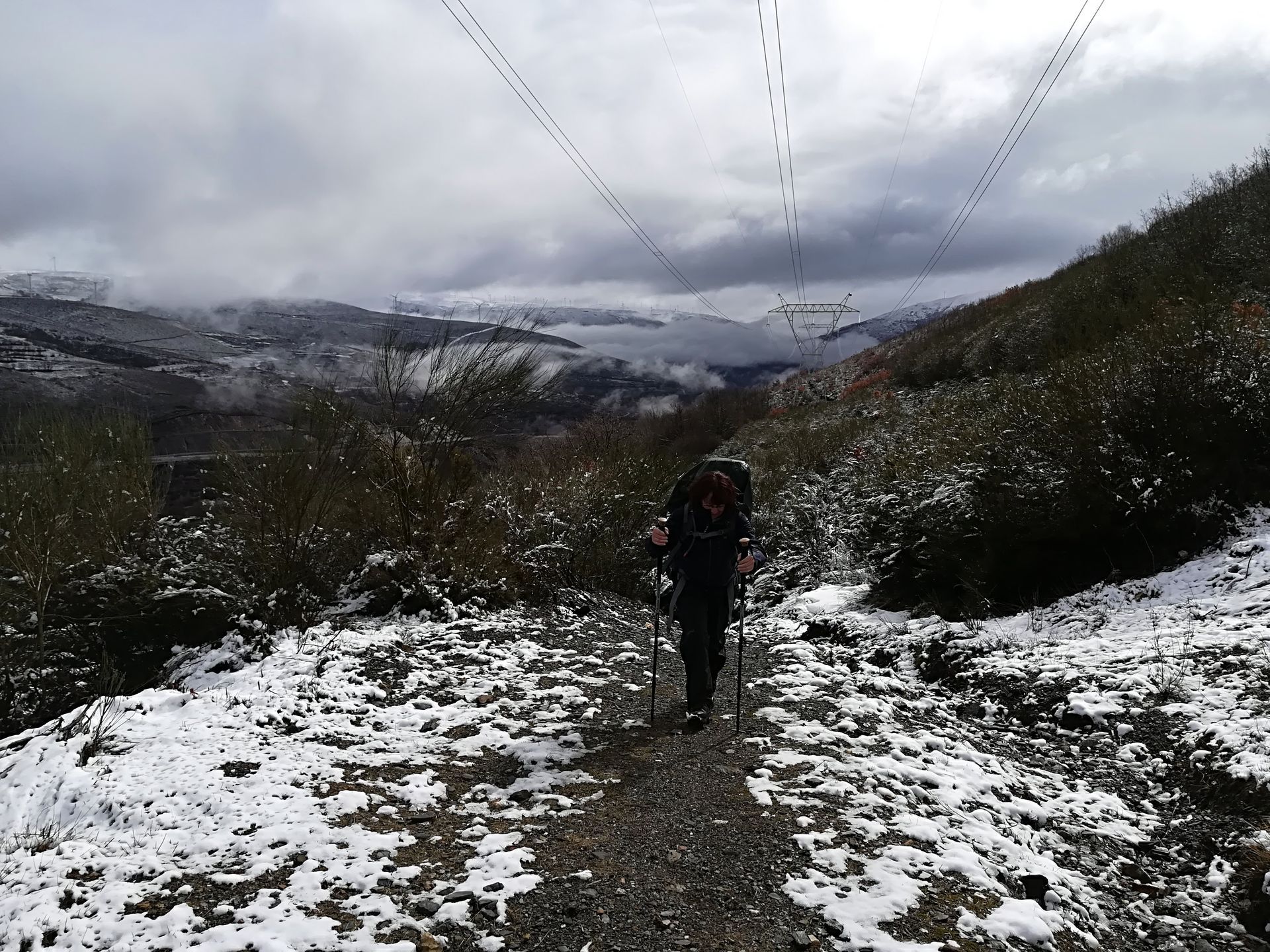 Eine ganze Woche sind wir jetzt schon unterwegs und es ist immer noch kalt und regnerisch. Für die Strecke bis zum Pass hinauf brauchen wir gute zwei Stunden und überholen dabei die Französin, die am Morgen zusammen mit uns die Herberge verlassen hat, aber ohne Frühstück gleich losgelaufen ist. Kurz vor dem Pass müssen wir durch einen Tunnel und als wir auf der bergzugewandten Seite wieder herauskommen, trauen wir unseren Augen nicht. Es schneit! Wir sind völlig durchfroren und da es sowieso schon auf Mittag zugeht, kehren wir im Hotel Padornelo oben am Pass ein und gönnen uns ein Mittagessen. Die Französin schließt sich uns an und es kommt eine angeregte Unterhaltung zustande. Als wir später wieder aufbrechen, verlieren wir sie aber irgendwie und sollen sie an diesem Tag auch nicht noch einmal sehen.