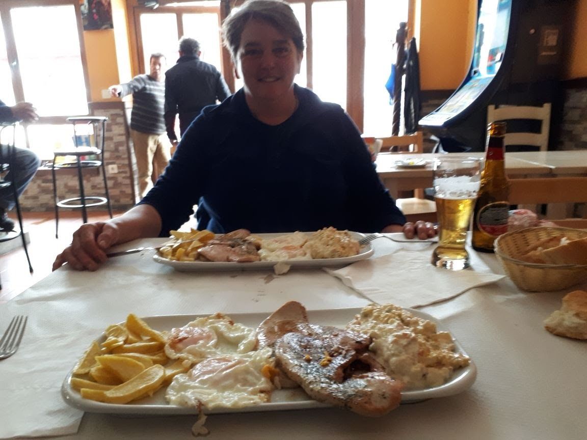 Zum Essen gehen wir am Abend in ein Restaurant etwas außerhalb des Dorfes, das uns die Vermieterin empfohlen hat. Ich rechne fest damit, die Vermieterin auch als Restaurant-Besitzerin anzutreffen, aber ich irre mich. Bei den beiden alten Leutchen handelt es sich wohl um ihre Eltern. Eine Speisekarte gibt es nicht, der betagte Wirt rattert eine Liste mit Speisen herunter. Ich verstehe nur Forelle und Roswitha beschließt, dass wir dann heute Forelle essen. Es gibt Pommes und Blumenkohl dazu und in der Wirtsstube ist es derart kalt, dass wir uns mit dem Essen sehr beeilen. Zurück in der Herberge ist derweil das Pärchen auf Hochzeitsreise, das wir von Alba y Soraya her kennen, in den Bau-Container eingezogen. Mit ihren Fahrrädern sind sie deutlich schneller als wir und auch schneller als ich im letzten Jahr war.
