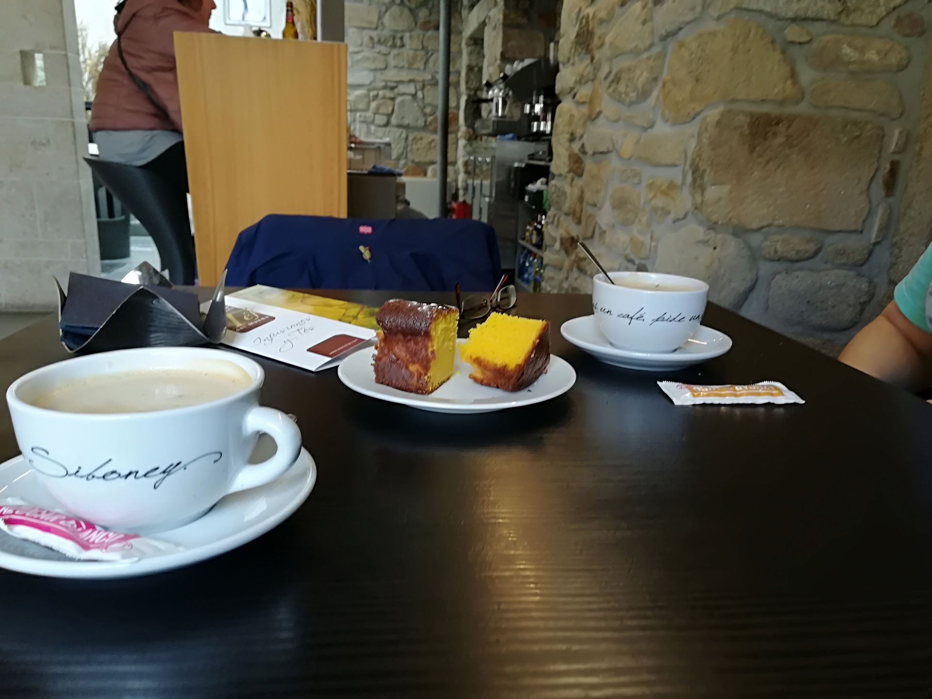 Um 7.00 Uhr klingelt ein Wecker. Es ist stockdunkel und ich drehe mich im Bett nochmal um. Als wir dann eine halbe Stunde später aufstehen, finde ich den Schlüssel für die Haustüre an einem Haken neben der Tür. Wir frühstücken in der Bar neben der Herberge und brechen dann auf.