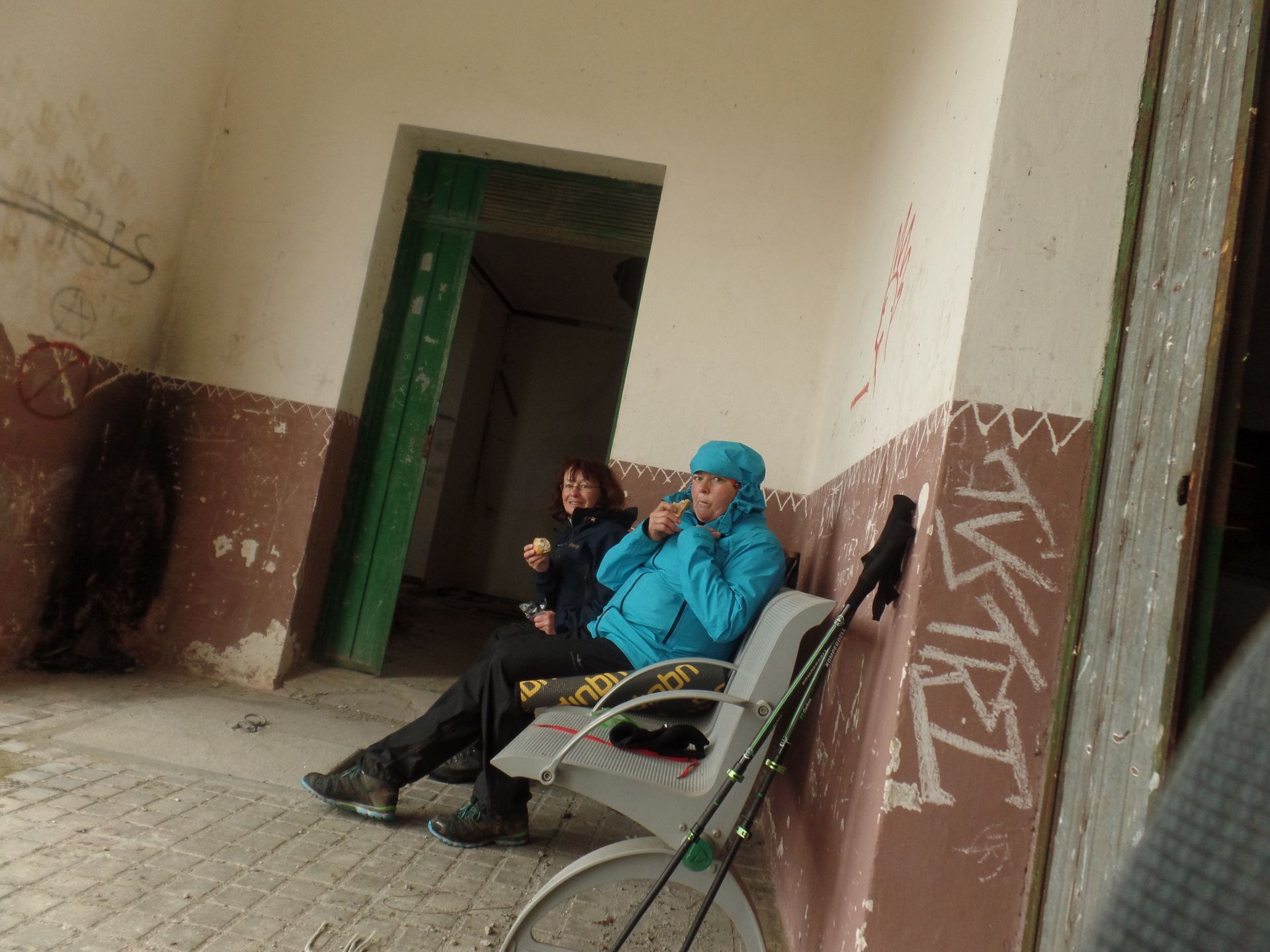 Gegen Mittag entdecken wir einen Bahnhof, was uns veranlasst, unsere Schritte zu beschleunigen. Endlich ein warmer Unterschlupf. Wir hoffen auf eine Sitzgelegenheit in der Schalterhalle. Doch beim Näherkommen macht das Gebäude einen sehr heruntergekommenen Eindruck und wir müssen uns mit einer Bank unter dem Vordach begnügen. Das Betreten des Bahnhofs ist wegen Einsturzgefahr verboten. Wenigstens ist es hier ein wenig windgeschützt. Das dazugehörige Dorf hat diese Bezeichnung auch nicht wirklich verdient. Und doch sind ein paar wenige Häuser noch bewohnt. Später am Tag sollen wir sogar den Eigentümer des „schönsten“ Hauses dieser zerfallenen Ansiedlung kennenlernen.