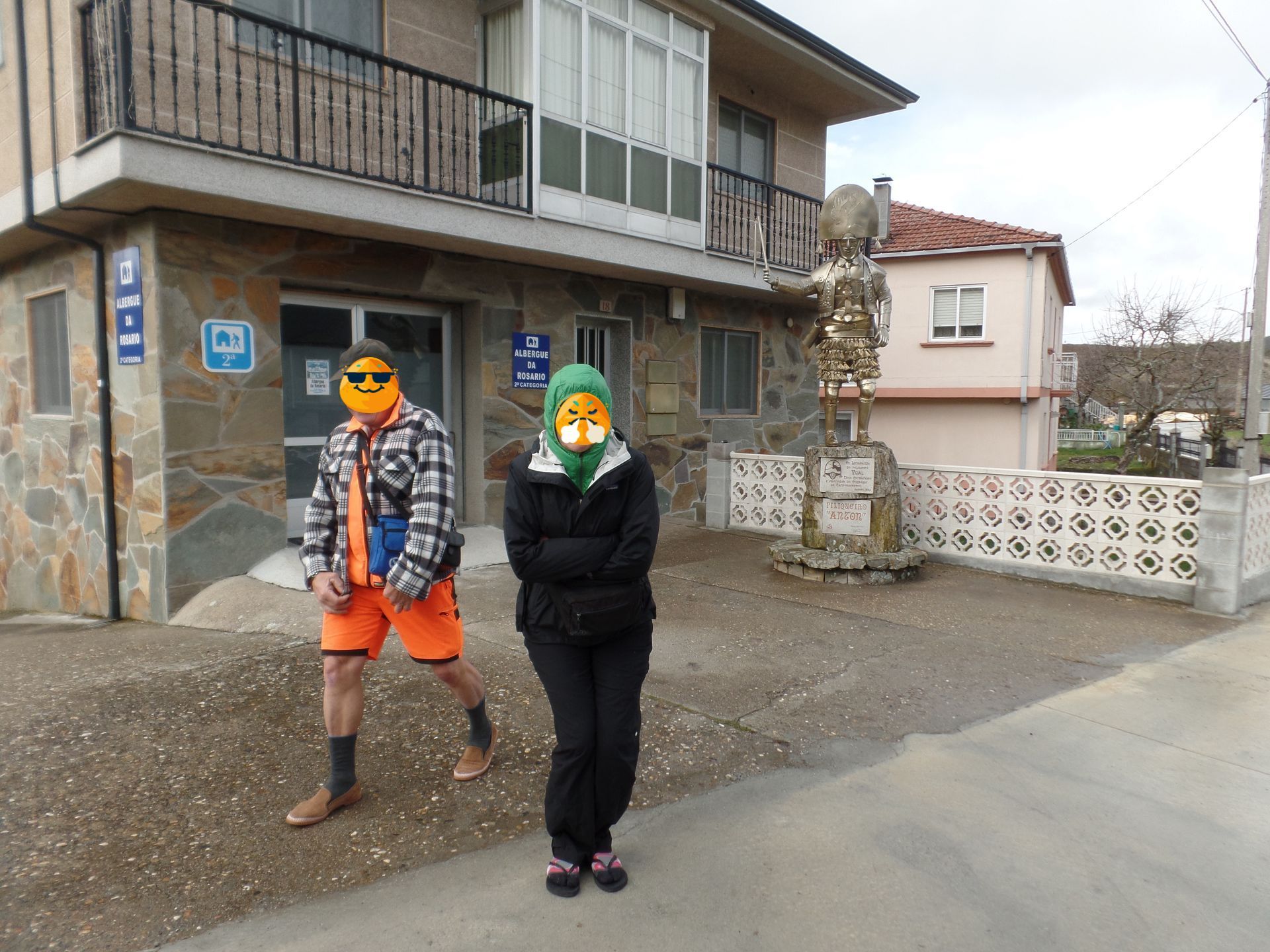 Wir nutzen die kurze Rast und ordern via Smartphone unser Zimmer für die kommende Nacht in Laza. Wir haben beschlossen, dass wir nicht in der Pilgerherberge in Alberguería übernachten wollen. Das ist nämlich auch wieder eine Kultherberge und wir haben von der letzten noch die Schnauze voll. Unsere Körper sehnen sich nach einer Nacht in einem ordentlichen Bett in einem schönen warmen Zimmer, ohne Schnarcher und ohne nasse Männerunterhosen und -socken auf der Heizung. Wir kommen bereits mittags in Laza an und können erst in einer Stunde einchecken. So steht es zumindest auf dem Schild an der Haustür. Doch wenige Minuten nachdem wir uns auf der Bank unter dem Vordach niedergelassen haben, kommt die Oma des Hauses und ruft sofort ihre Tochter an, damit diese uns in Empfang nimmt. Die Oma spricht übrigens ein bisschen Deutsch und ist in ihrem Morgenmantel und den frisch frisierten lila-rosa Haaren eine auffallende Erscheinung.