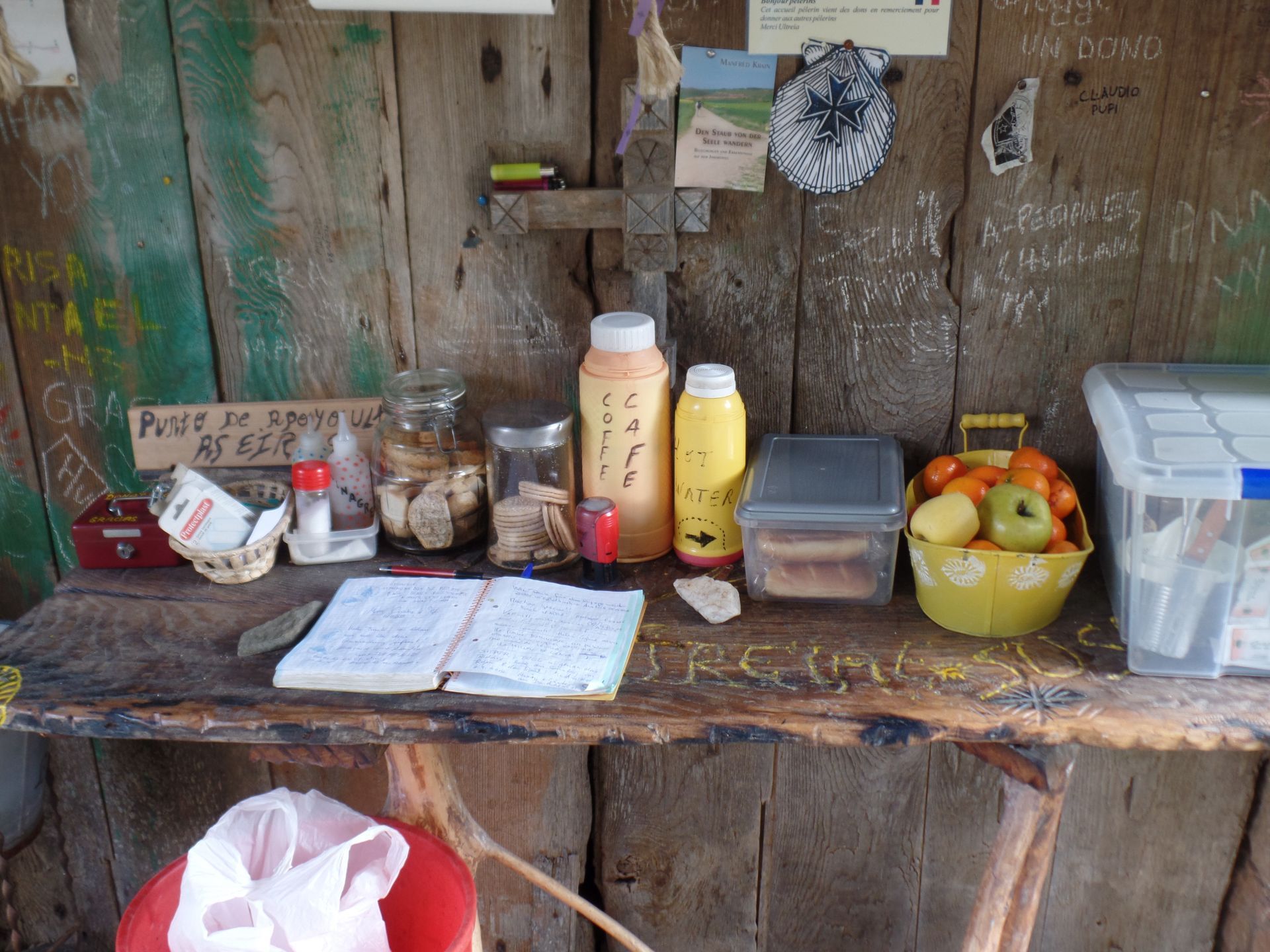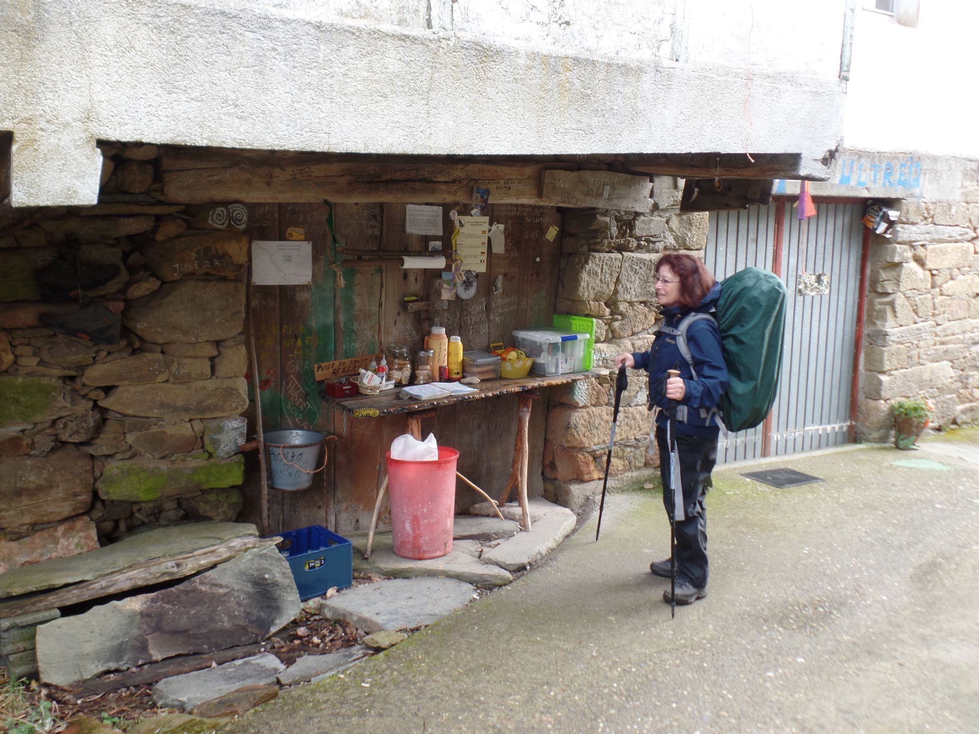 Bereits beim Betreten des Dorfes Eiras hören wir Musik, die offensichtlich aus einem Radiogerät strammt, was uns sehr verwundert, da auch dieses Dorf wie ausgestorben wirkt. Doch schon in der nächsten Kurve entdecken wir des Rätsels Lösung. Boxenstopp! Unter einem Balkon hängt das Radio, darunter steht eine Bank und ein Tisch und auf diesem findet man alles, was ein Pilgerherz höherschlagen lässt: Obst, kalte Getränke, Müsliriegel, Kekse, Schokolade, Kaffee und Tee in Thermokannen, Blasenpflaster, Sonnencreme (!). Bei hochsommerlichen Temperaturen sicher beliebt bei durstigen Pilgern. Und das alles gegen Spende!