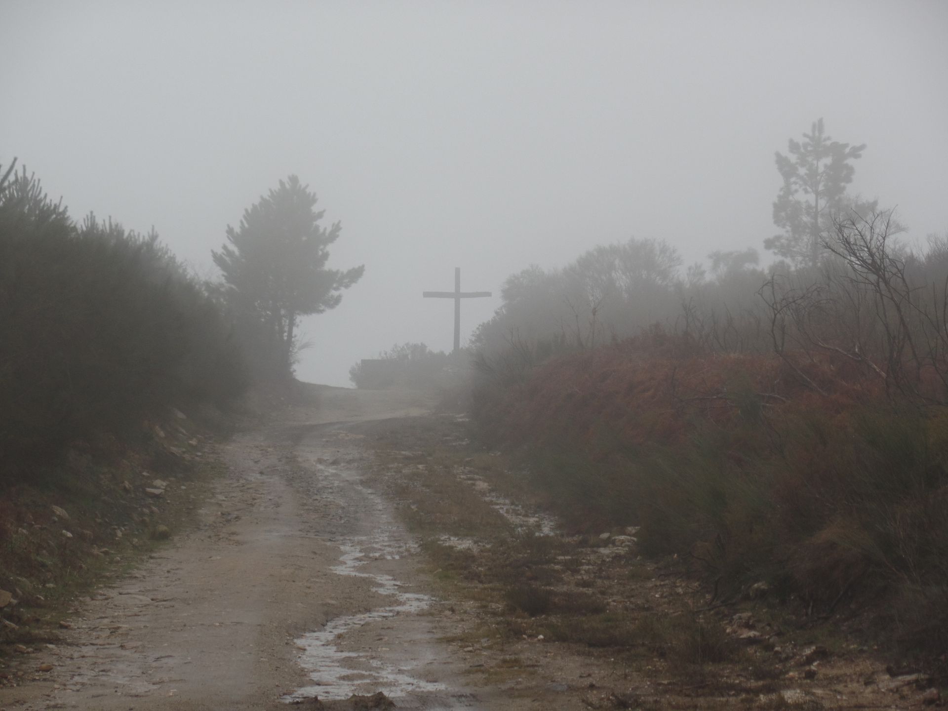 Das Frühstück müssen wir uns im Aufenthaltsraum nicht nur selbst herrichten, wir mussten es gestern sogar selbst einkaufen. Wir hören, wie Brian, der englische Pilger, sein Zimmer verlässt und die Treppe hinuntergeht. Anscheinend will er schon los, doch nach wenigen Augenblicken ist er wieder da und frühstückt mit uns. Kurz vor halb zehn verabschiedet er sich von uns und meint, er müsse sich beeilen, sonst schaffe er seine heutige Etappe nicht. Schnappt seinen Rucksack und verschwindet. Wir folgen ihm nach ein paar Minuten, denn wir wollen den Taxifahrer nicht warten lassen. Und wer steht da unter dem Vordach mit Rucksack und drei Koffern und wartet auch auf das Taxi? Unser fleißiger englischer Pilger! Es ist ihm sichtlich unangenehm, dass er sich mit uns das Taxi teilen soll. Zusammen fahren wir im Nebel die unübersichtliche Bergstraße hoch und sind froh, dass wir hier nicht zu Fuß unterwegs sind. Es gibt nämlich nur diese Straße hier rauf, keinen Wanderweg, Feld- oder Waldweg. Und bei dem Verkehr und den Sichtverhältnissen ist eine Wanderung auf dieser Straße nicht gerade ungefährlich.