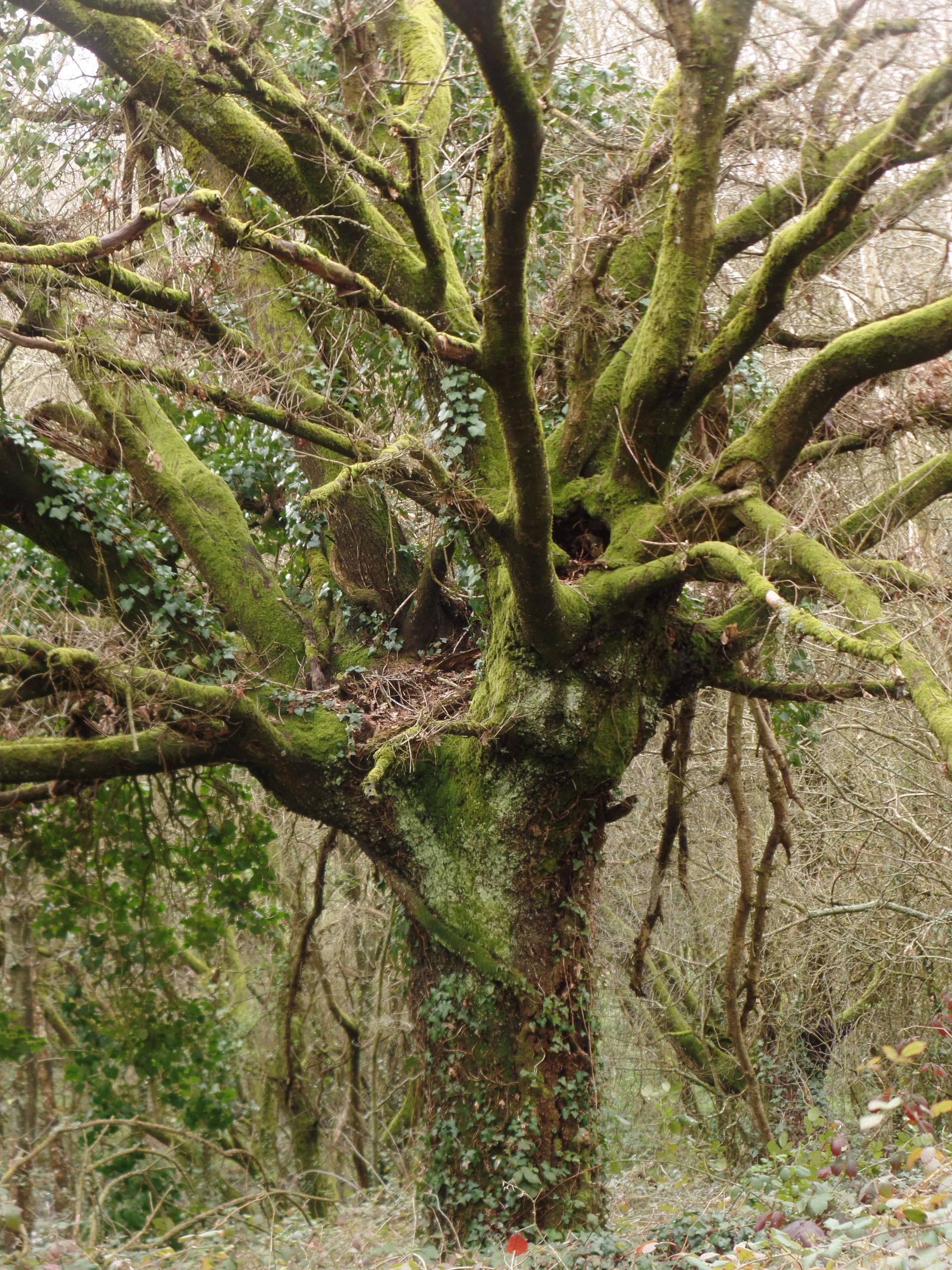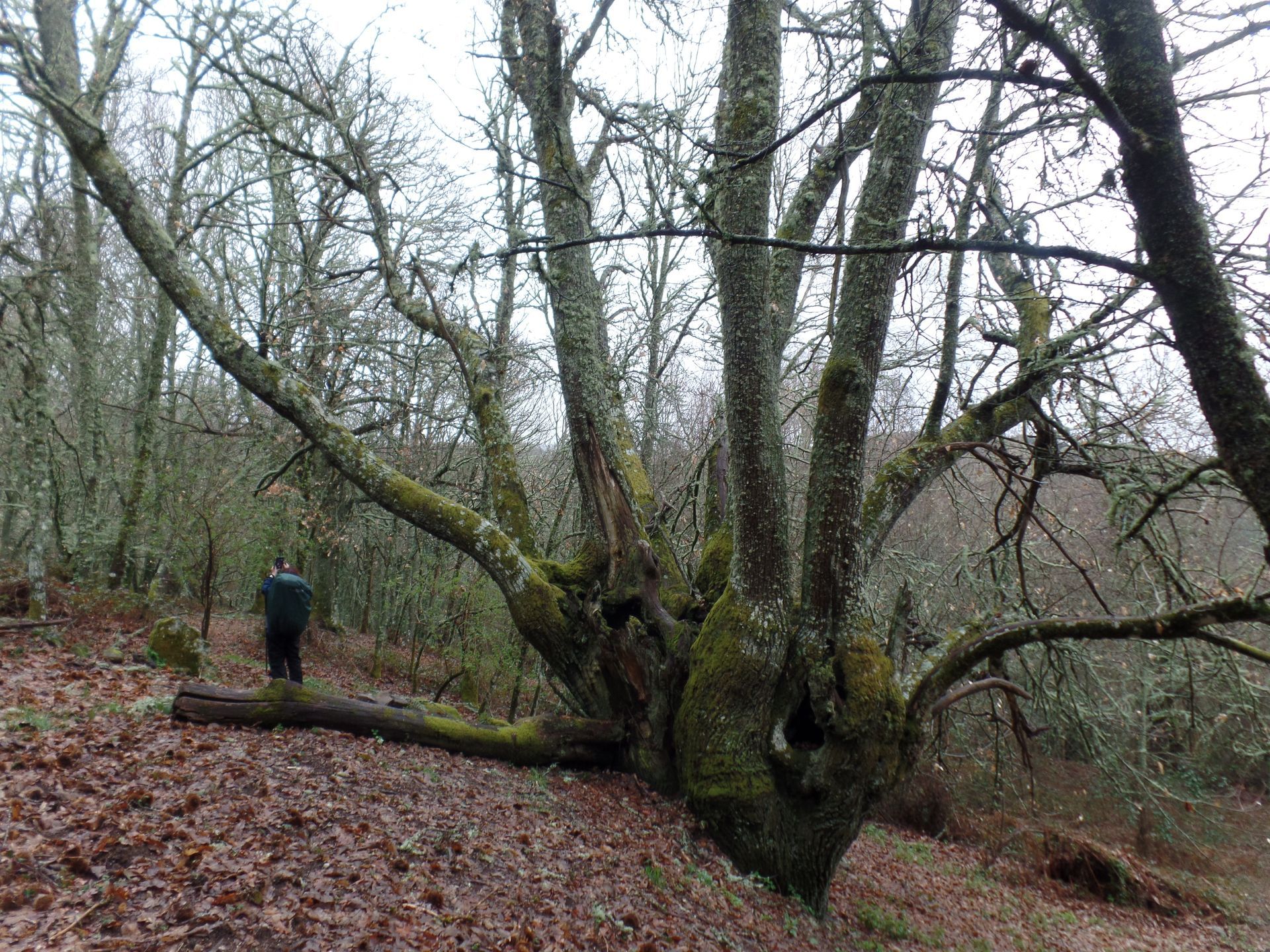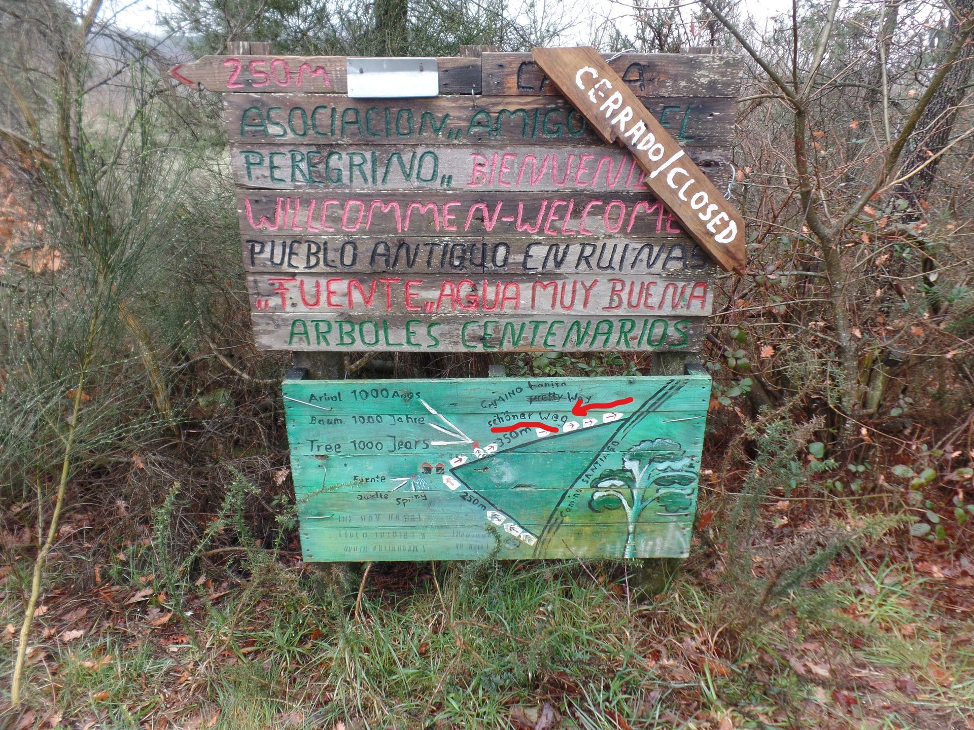 Weil wir auch heute Zeit haben und keine anstrengenden Aufstiege mehr vor uns liegen, erlauben wir uns ganz spontan einen Umweg von angeblich 500 Metern, über einen angeblich schönen Weg, zu einem versteckt liegenden Anwesen im Wald. An einem Abzweig wird in mehreren Sprachen auf dieses Anwesen hingewiesen, das angeblich Essen, Getränke und Übernachtungsmöglichkeiten anbietet und in dessen unmittelbarer Nähe es einen angeblich 1000jährigen Baum geben soll. Den wollen wir uns natürlich nicht entgehen lassen. Was ich dabei übersehe und erst viel später auf den Fotos bemerke, ist das Holzschild, das quer über die rechte obere Ecke der Hinweistafel genagelt ist, und auf dem steht: CERRADO/CLOSED/GESCHLOSSEN. Der Weg ist zunächst sehr schön, dann sehr matschig und wir weichen vom Weg in den Wald aus. Dabei stolpern wir dann eher zufällig über den 1000jährigen Baum, der schon imposant anzusehen ist. Wir stellen aber fest, dass wir Bäume dieser Art schon öfter auf unserem Weg gesehen haben. Waren die alle 1000 Jahre alt?