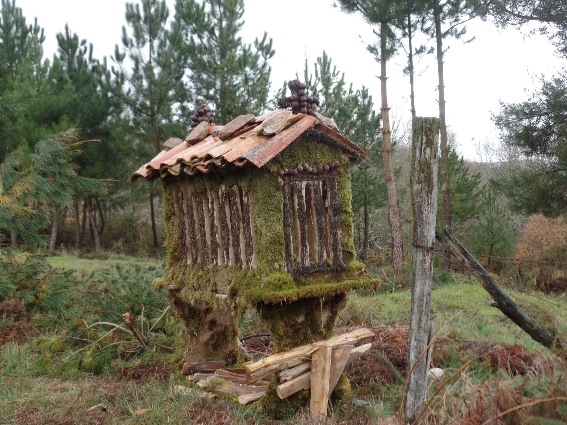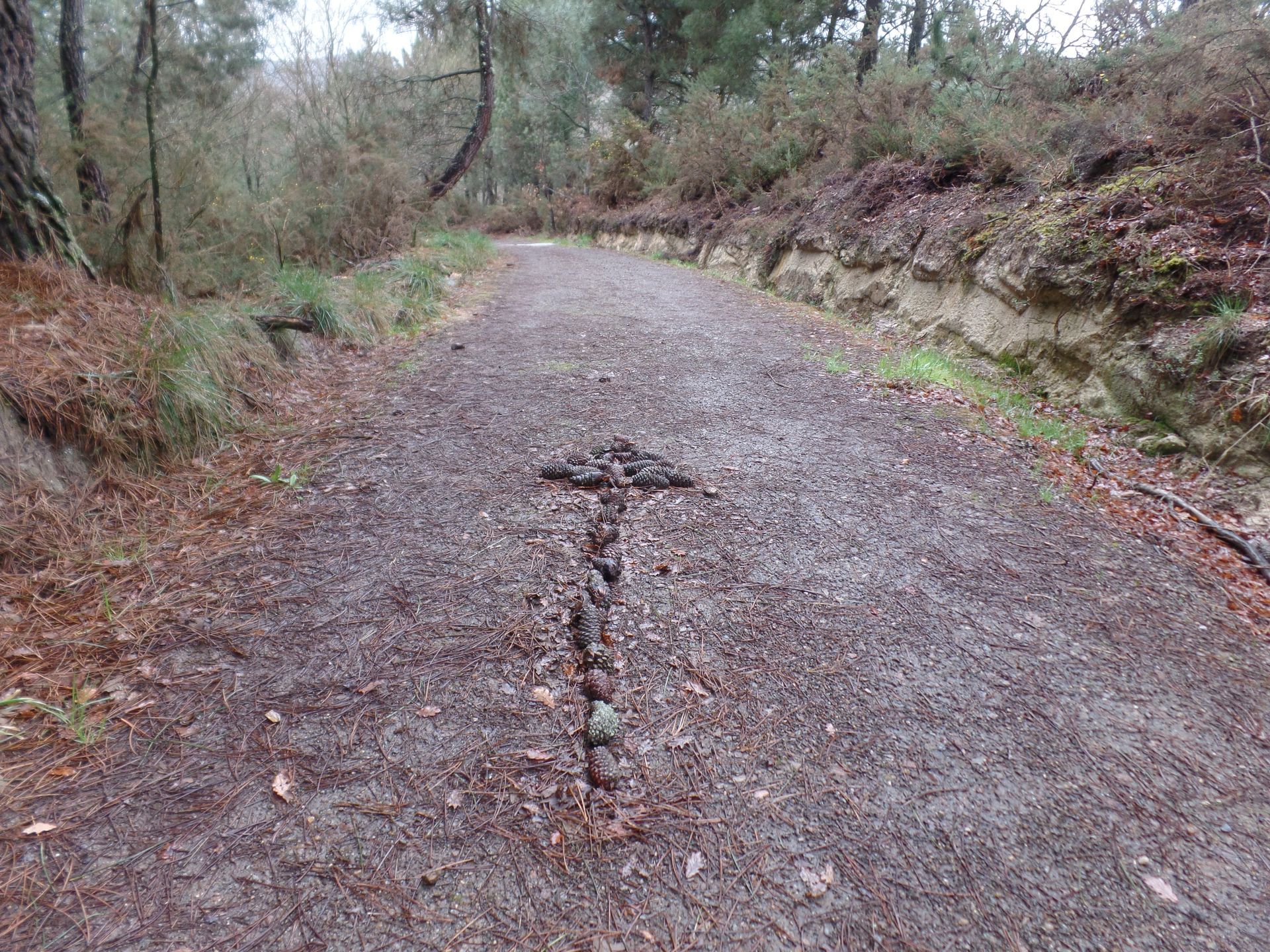 Heute ist der Tag der schönen Gartenmauern und Gartentürchen. Wir treffen auf Steinmauern, die aus den unterschiedlichsten Steinen errichtet wurden, allesamt mit roten oder hellblauen Türen. Auch die Pfeile, die uns den Weg weisen, bestehen aus verschiedenen Materialien, wie Steine, Holz und Fichten- oder Pinienzapfen.