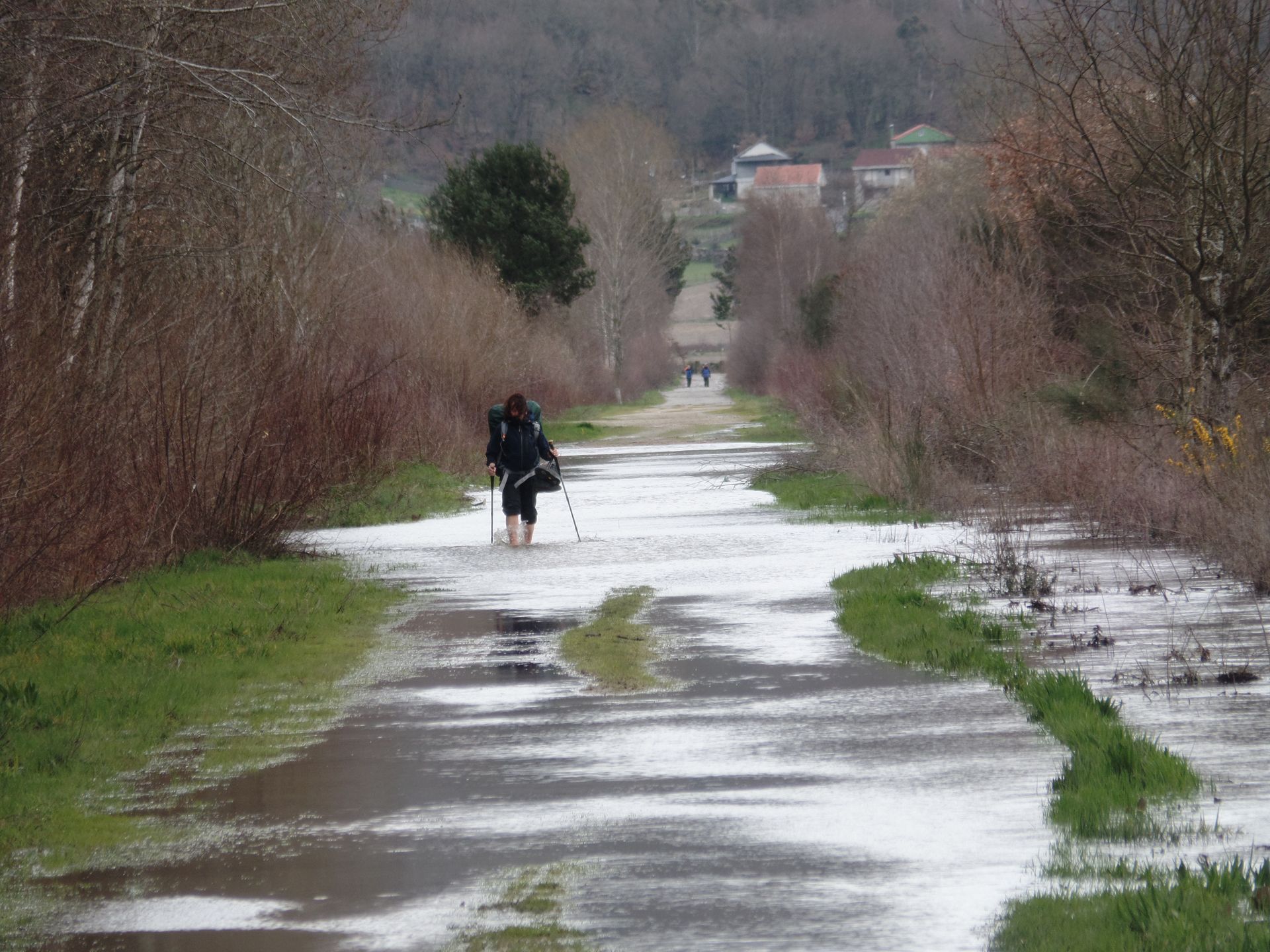 Wir sind gerade wieder bei meinen Schuhen und dem Rucksack angekommen, als aus einer Querstraße ein Auto auftaucht. Der Fahrer und sein Beifahrer fragen besorgt, ob sie uns irgendwohin bringen sollen. Nun, wir sind ja jetzt schon durch, ich habe aber gesehen, dass in einiger Entfernung noch zwei Pilger auf die Überschwemmung zusteuern und ich bitte unsere verhinderten Retter, doch wenigstens diese beiden trockenen Fußes über den Weg zu bringen. Sie bestehen darauf, dass wir zu ihnen ins Auto einsteigen sollen, weil die Überschwemmung hier noch nicht zu ende ist, sondern weitaus größere Ausmaße hat, als es scheint. Im Jeep geht es dann erneut durch die Pfütze und wir lesen die beiden Pilger auf, die sich zu uns auf die Rückbank quetschen. Und wieder zurück durchs Wasser. Etwa eineinhalb Kilometer weiter lassen die beiden uns dann am Beginn einer kleinen Steigung aussteigen. Die zwei Pilger murmeln etwas von wegen „sie hätten das schon auch laufen können“, verabschieden sich kurz und eilen weiter. Undank ist der Welten Lohn! Zuvor macht allerdings einer der beiden mit meinem Handy ein Foto von uns und unseren Rettern, der Fahrer des Wagens gibt mir seine Handynummer und bittet mich, ihm das Foto zu schicken. Mache ich natürlich und – mache ich nie wieder! Es soll ein halbes Jahr dauern bis mir der Mann, der etwa fünf Jahre älter ist als ich, nicht mehr ständig schreibt. Wir kehren nach einer Stunde in einer Bar ein und werden sofort freudig begrüßt. Die Wirtin hat bereits das Foto von uns und unseren Rettern auf ihrem Handy.