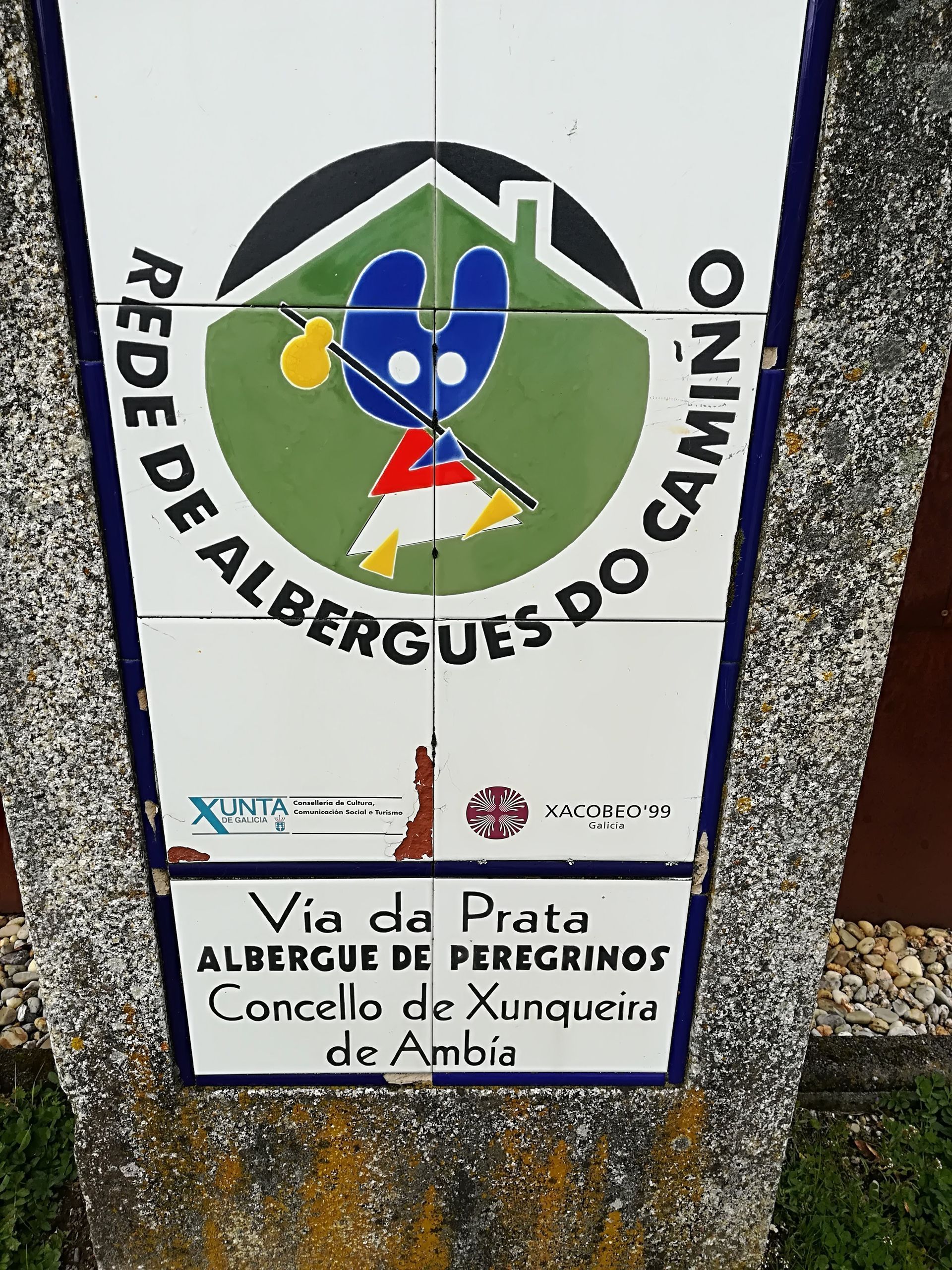 Die Wolken bringen heute immer wieder Nieselregen mit und nicht überall, wo Wasser fließt, war vorher auch ein Bach. Um die Mittagszeit kehren wir in einer Bar ein, um eine Kleinigkeit zu essen, bzw. um uns ein paar Bocadillos (Sandwichs) für unterwegs zu kaufen. Florian möchte gern weiter. Man merkt ihm an, dass wir für seinen Geschmack zu langsam unterwegs sind. Roswitha geht es aber aktuell nicht gut. Sie sieht aus, als würde ihr Kreislauf gerade schwächeln und ihr Blutdruck in den Keller fahren. Ich biete Flo daher an, dass er allein weitergehen kann. Ich bleibe bei Roswitha. Er kann es erst nicht recht glauben, dass ich ihn so einfach ziehen lasse. Ich habe seiner Mutter immerhin versprochen, ihn heil wieder heimzubringen. Aber, hallo, er ist 16 und weder auf den Kopf noch auf den Mund gefallen! Er spricht englisch, kann sich also verständigen, und wird die Herberge von Don Blas schon finden. Der Weg ist gut beschildert und ich zeige ihm vorsichtshalber noch ein Foto aus dem Pilgerführer. Darauf ist schön zu sehen, dass vor der Herberge ein großer Stein, mit einem darauf eingemeißelten Pilger steht. So stürmt er zur Tür hinaus und lässt uns lahme, alte Weiber zurück, ohne etwas zu essen und ohne Bocadillos für unterwegs. Er weiß halt noch nicht, dass ein zu frühes Ankommen in einer Herberge nicht immer von Vorteil ist und, dass es dort auch nicht immer gleich was zu essen gibt. Nicht alle Herbergen sind so gemütlich, wie die von letzter Nacht. Aber er ist ja zu einer Kult-Herberge unterwegs. Da wird´s schon passen!