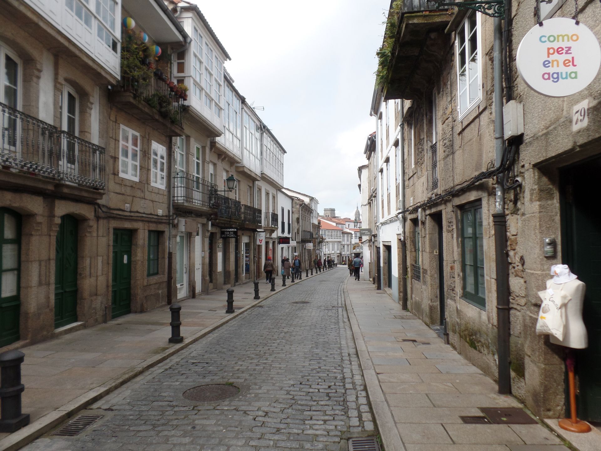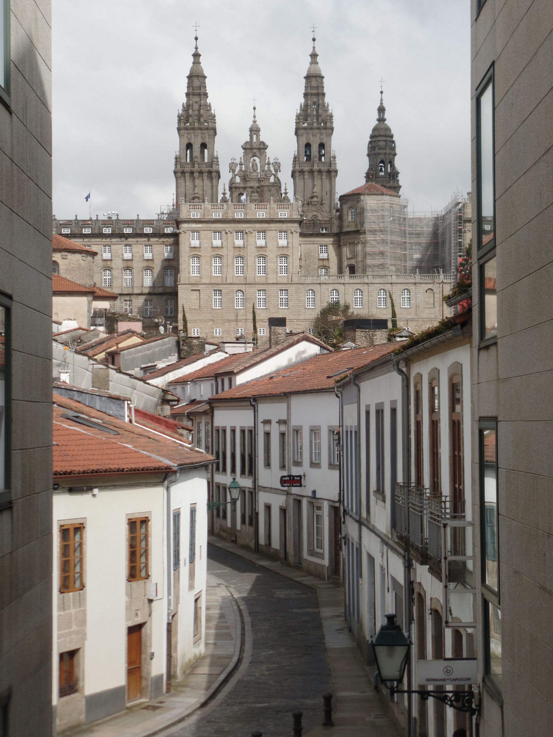 Wir schlendern heute auf dem Camino Francés Richtung Porta do Camino, staunen, was es auf dem Markt Abastos alles zu sehen und zu kaufen gibt, besuchen einen Park mit wunderschönem Blick auf die Stadt und die Kathedrale und essen schließlich in einem Restaurant neben dem Palacio Reyes Catholicos zu Mittag. Zum Restaurant gehört auch eine Pension, wo man für ein Doppelzimmer 220 Euro die Nacht zahlt. Und es ist dort nicht so schön wie in unserer Pension und näher an der Kathedrale ist man auch nicht. Es wohnen aber nur Deutsche dort.