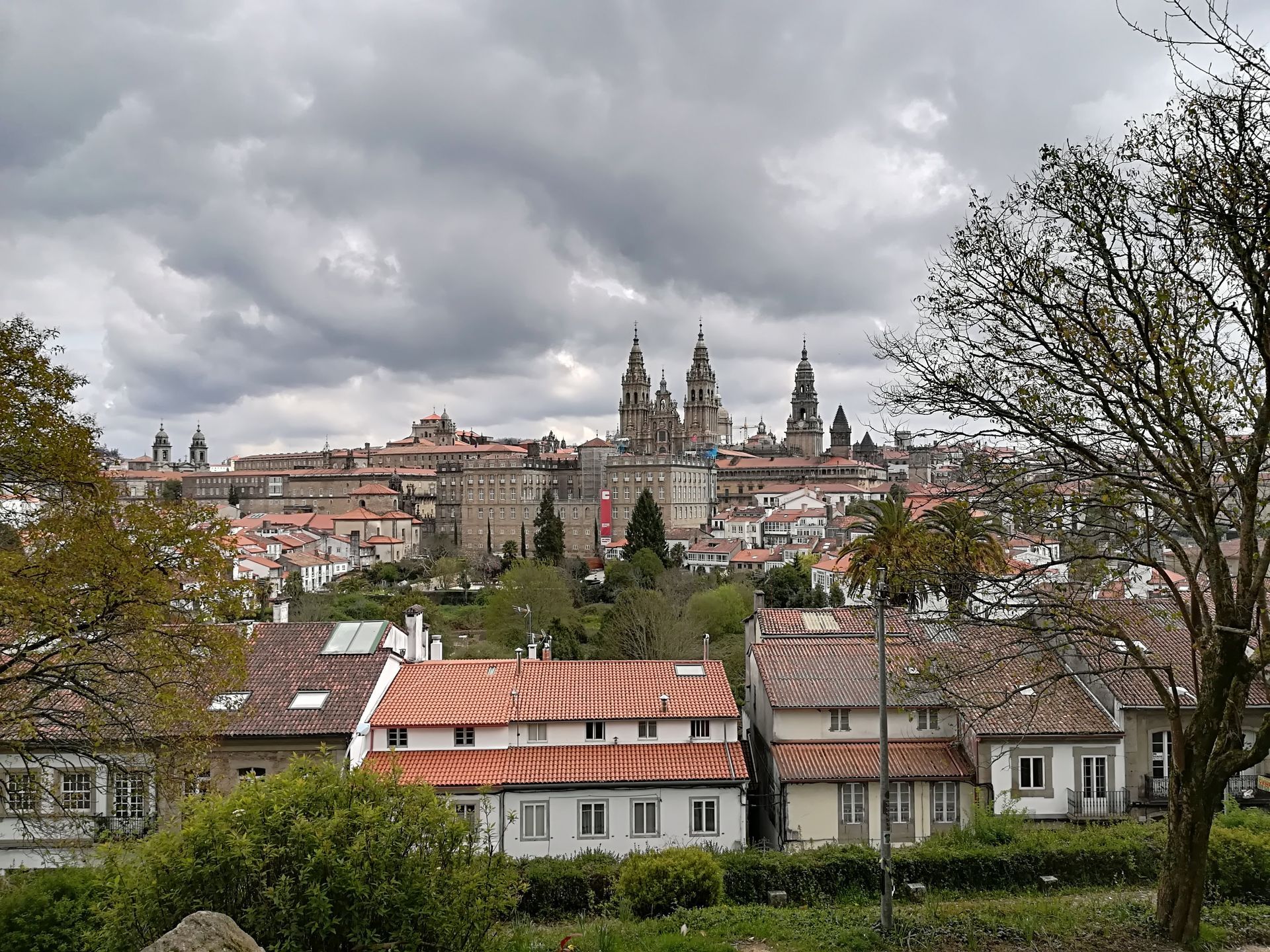 Wir frühstücken am Parque San Lázaro und besichtigen dann die Kathedrale und den Friedhof am Kloster San Franzisco. Die Herberge, in der wir unsere Credencials abstempeln lassen wollen, hat um diese Zeit ihre Pforte noch nicht geöffnet. Daraufhin holen wir in der Kirche Santa Eufemia einen Priester aus dem Beichtstuhl, damit wir doch noch zu dem Abschluss-Stempel für unsere Pilgerausweise kommen. Um die Mittagszeit verlassen wir Ourense und fahren mit dem Zug nach Santiago de Compostela, wo wir am frühen Nachmittag eintreffen und zunächst unsere gebuchte Unterkunft suchen. Mit der Pension Entrecercas haben wir eine wirklich gute Wahl getroffen – sauber, ruhig, gemütlich, freundliches Personal, zentral gelegen, nur einen Steinwurf von der Kathedrale entfernt, und das alles für 57 Euro die Nacht (für zwei Personen) incl. Frühstück. Wir werden zwei Nächte hier bleiben, weil Roswitha vor unserer Reise noch nicht wusste, ob sie ein zweites Mal mitkommen wird, aber dennoch Santiago und die Kathedrale gerne sehen würde.
